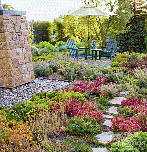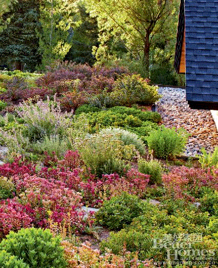 屋顶的景观风格采用野趣外加层叠的展现手法,利用生长缓慢 的绒毛百里香和景天苗芽勾勒行步道和青石板缝隙,高一些的植物 则以一种轻松而自然的方式环绕屋顶周边。即便是在科罗拉多的山 谷地带,屋顶的土壤温度也会很高,基本上在60℃以上,因此Jon只 选用最顽强的植物,它们不但要高度耐旱,而且要能耐受反射光。