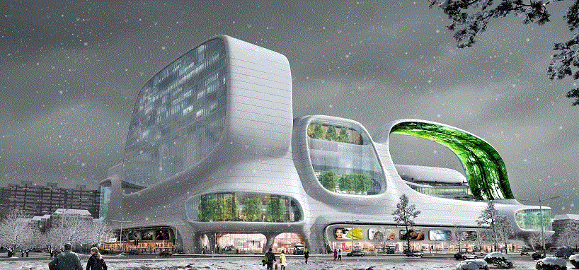 amphibianArc设计的翰海东风镇中心位于郑州市西北部的高档住宅小区。设计师对购物中心做了完全颠覆的诠释。这座购物中心位于现代大都市发展的核心区,35万平米建筑共有九层,设有购物和家庭娱乐等设施,另有一个抬升的喷泉广场、一条室内运河、多个主题餐厅、一个酒店大楼,一个标志性的LED“雨篷”覆盖横空而过如一条彩虹桥。