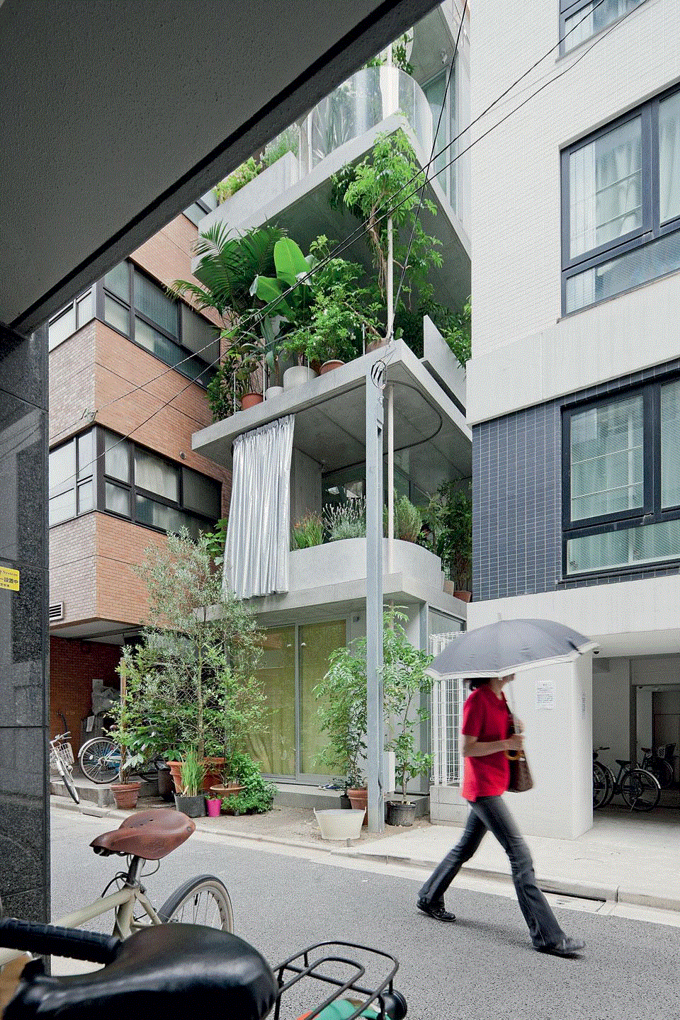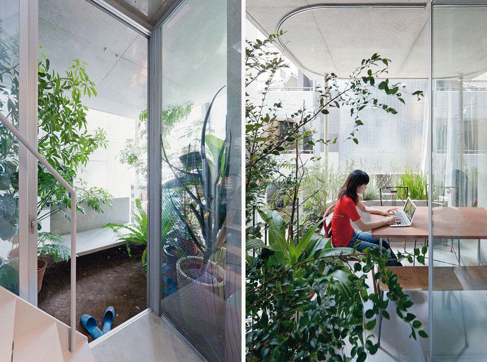 建筑楔入两座高层建筑之间,消失在主路上,狭窄的“西则住宅”虽然临街,却特别注重私密性与公共性的处理,通过临街立面大量植物的种植摆放起到既隔绝视线的又不完全封闭的效果。从街上看去很容易让人误以为是一座神秘的垂直花园。