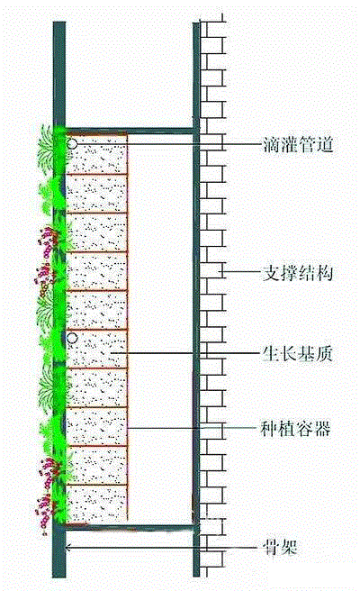 4.摆花式。即在不锈钢、钢筋混凝土或其它材料等做成的垂直面架中安装盆花或直接在建筑墙面上安装人工基盘实现墙面绿化的形式,在人工支架的基础上,装上各种各样的栽培基质穴盘,穴盘有卡盆式、包囊式、箱式、嵌入式等不同种类。种植形式一般为盆栽摆设。该类型的特点是:适用于临时墙面绿化或立柱式花坛造景,一般使用滴灌或雾喷,通常是在人工基盘接入微灌设施以减轻管护压力。