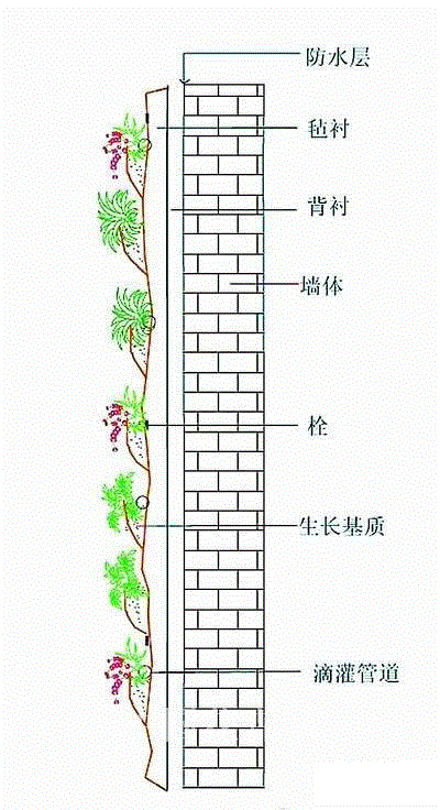 2.铺贴式。即在墙面直接铺贴生长基质与植物组成的栽培平面系统,或者是采用喷播技术在墙面形成一个种植系统。施工方法是直接铺贴生长基质与植物组成的栽培系统或喷播。该类型的特点是;可以将植物在墙体上自由设计或进行图案组合;直接附加在墙面,无须另外做钢架,并通过自来水和雨水浇灌,降低建造本钱;系统总厚度薄,只有10厘米至15厘米,并且还具有防水阻根功能,有利于维护建筑物,延长其寿命;易施工,效果好等。