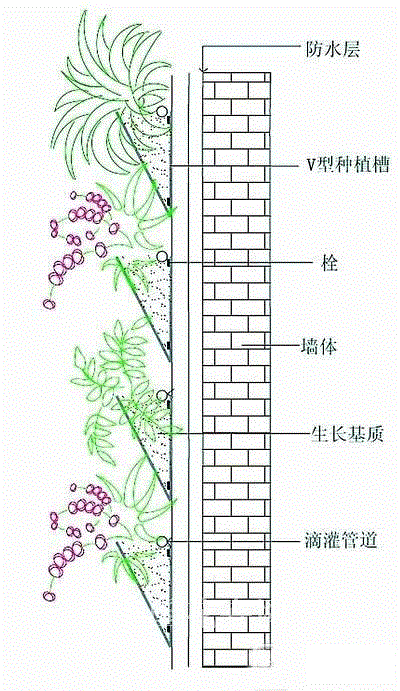 6.板槽式。板槽式即在墙面上按一定的距离安装V型板槽,在板槽内填装轻质的种植基质,再在基质上种植各种植物。这类绿化形式的特点是:施工简便灵活、造价低、适宜种植的植物种类多,兼备摆花式、攀爬及垂吊式墙面绿化的优点。适用的植物种类较多,可组合栽植灌木、花草或蔓生性强的攀爬或垂吊的植物;既可浇灌也可微灌。