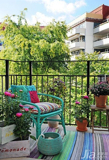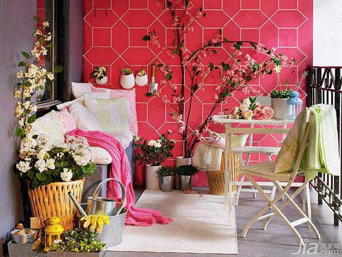 粉色的墙壁,让整个阳台色彩丰富起来,随意放几盆花卉,都能感受到浪漫的气息。脚下铺了一方柔软的毛毯,舒适又惬意。