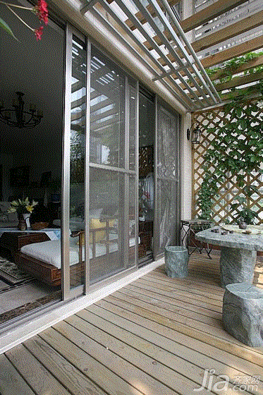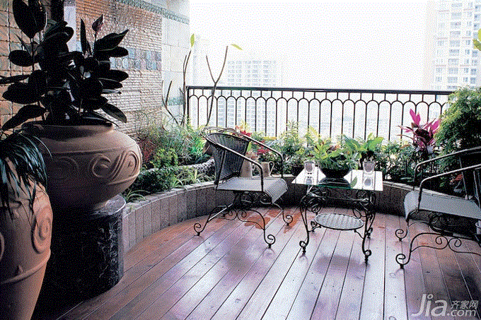 巧妙设计花园的形状,将阳台隔断成一个半圆形。木质的条形地板,更添了几分自然气息。