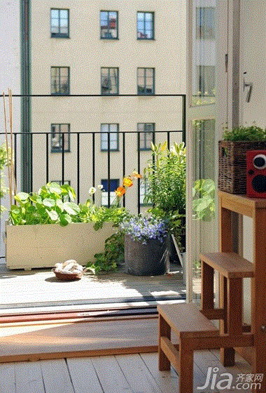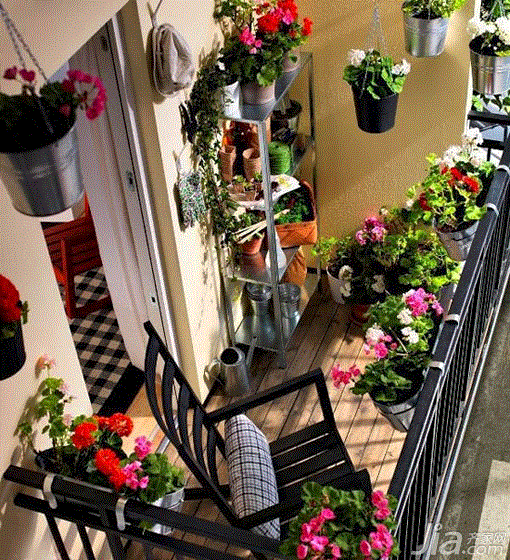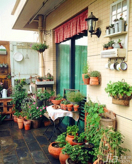 阳台空间不大,所以将数量较多的小花盆摆放在搁置桌上面,或悬挂在墙上,这样省空间且不显杂乱。