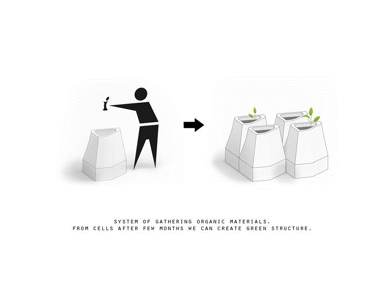 我们垃圾桶内垃圾的40%是有机废物,且堆制肥料是利用最早也是最廉价的回收再利用方式。我提倡的系统是通过我们的细胞容器收集切割的杂草,茶叶包,废纸,水果皮等等这些有机废物,等到有机物被土壤吸收分解后“细胞”便成为了有生命的建筑材料。