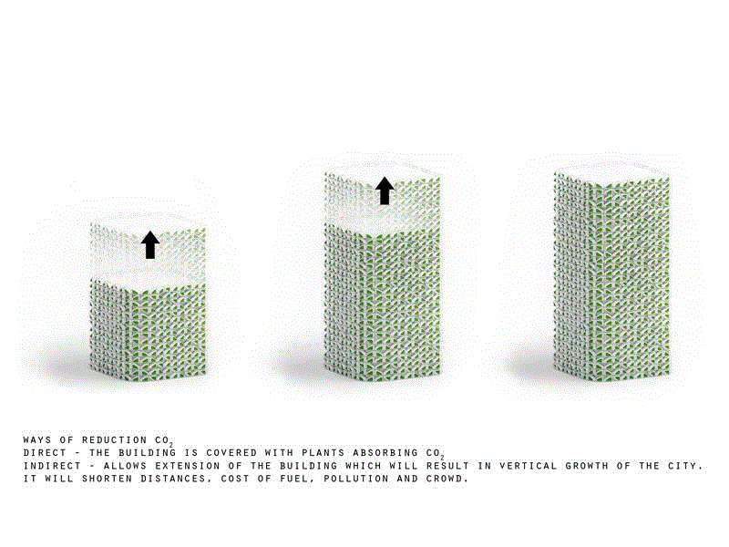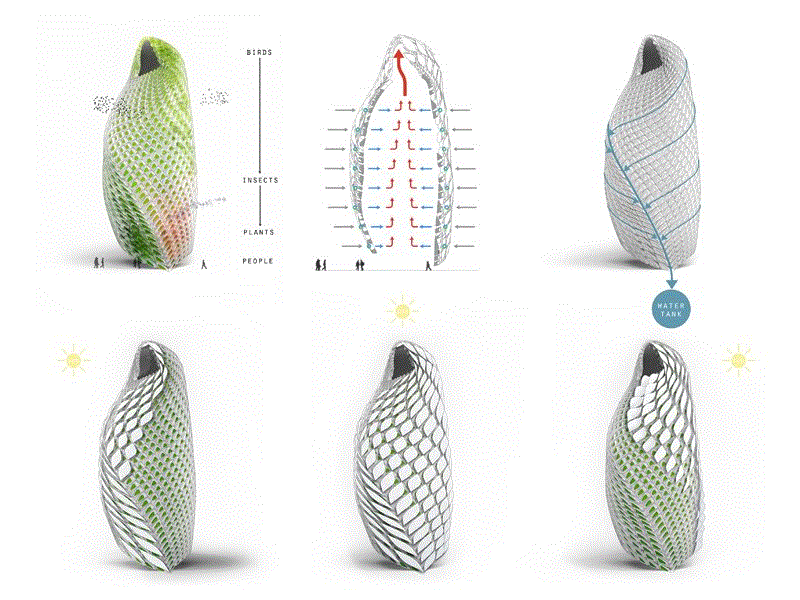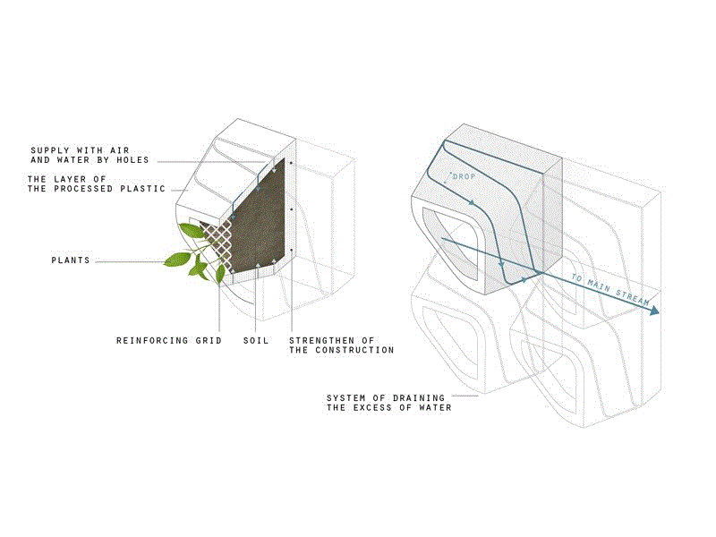 每个细胞的形状是如下两条原则结合的结果:废物的容器以及建筑的构造元素。这种墙可以成为植物生长的介质,这样在减少二氧化碳排放的同时调节了局部小气候。通过墙的构造方式改变,我们可以收集雨水,更多的鸟将会把外墙当做自己的小家。