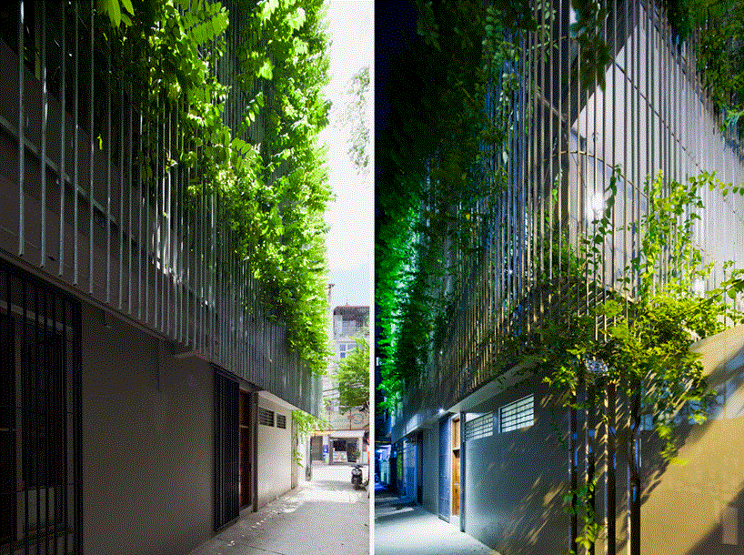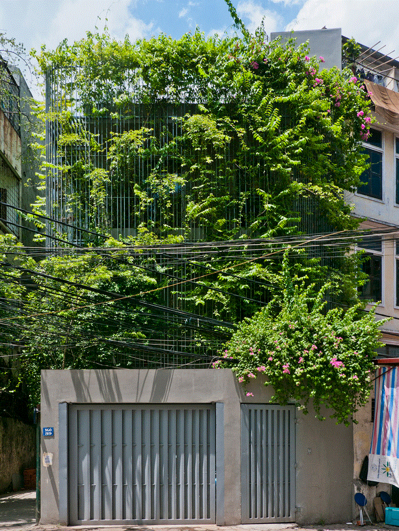 位置:位于越南河内的外墙生长着层层叠叠绿色观赏植物的街边住宅