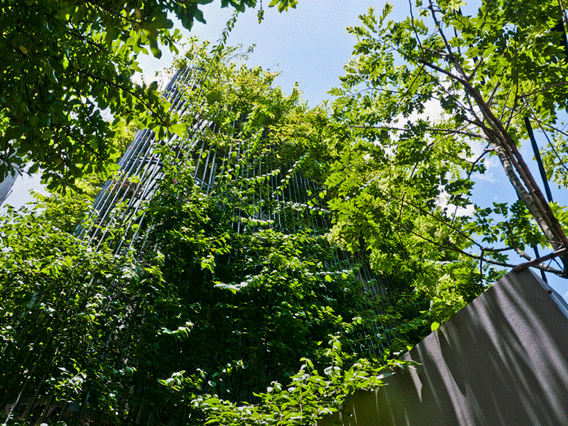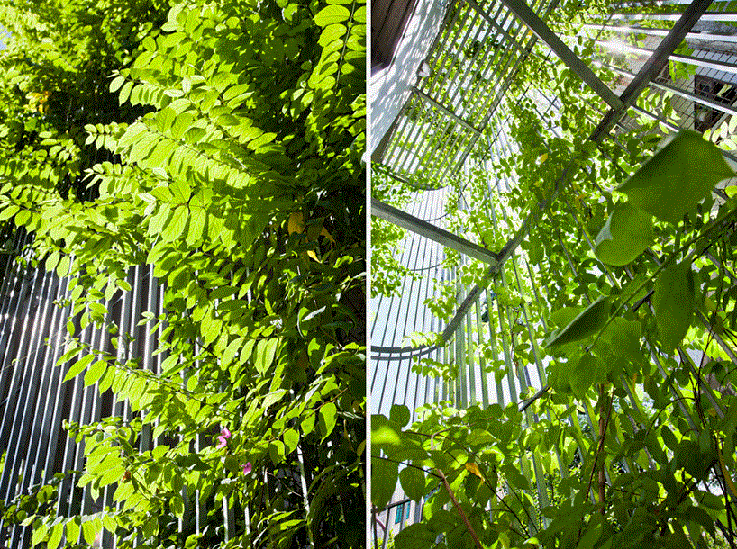 住宅楼墙外,像瀑布一样倾泻而下的植被,给人以强烈的清爽舒适感觉。