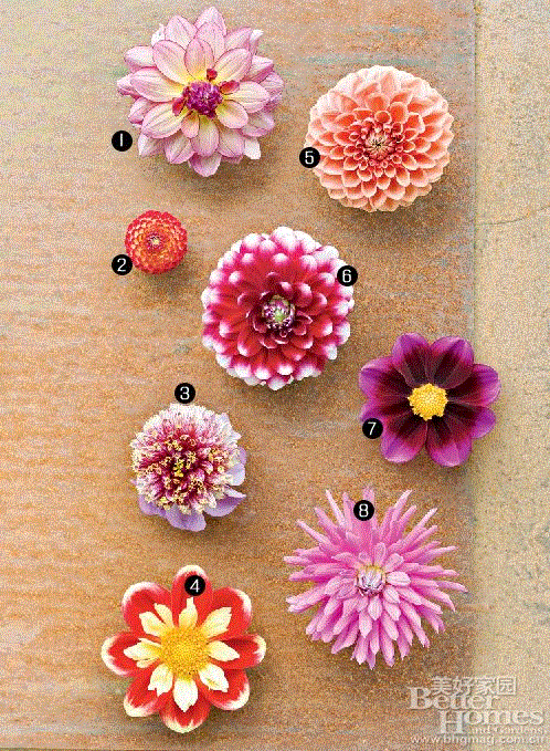 单瓣或双瓣小花在花盘中央形成针 垫状,代表品种“twilite”大丽花能够 长到120cm高。