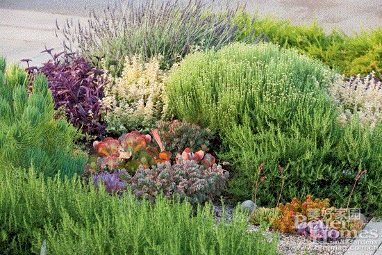 植物色彩的搭配效仿了加勒比海的珊瑚礁,Renee将柔和色 彩和艳丽色彩的多肉植物进行混搭,像蓝绿色的“蓝指”、水鸭色和珊瑚色的石莲花、浅橙色的大戟、黄色红尖的耳坠草等,带花边的绿色绵杉菊和紫叶的紫鸭跖草增强了反差效果。沿河床向上,植物过渡为原产自加州和其他地中海干燥地区的中型品种,而本地生的丹参、柠檬百里香、薰衣草和迷迭香则用叶子中的油脂给空气带来芬芳。花园的灌溉工具就是一把手持的塑料洒水壶。“草地的话你得天天浇或者隔一天浇一次水,”Steven说道,“现在我们两个月浇一次水,在酷热的季节也是如此。”剩下的时间基本用不着给植物人工浇水。