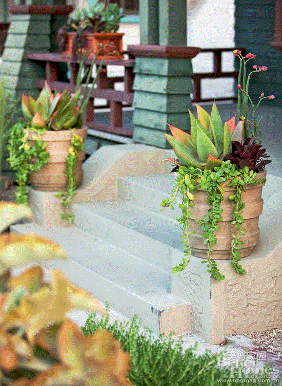 "无论是直接种在地里还是花盆中,多肉类植物都可以给花园增添几分色彩和质感。多肉 植物的盆栽与其他植物盆栽一样,要和周围的建筑和景观相呼应才能达到最佳视觉效果。这款圆柱形高花盆的横凸纹图案与小屋的雅致气息相得 益彰。一株莲座状的珊瑚芦荟 (银芳锦)是整个盆栽的焦点, 藏于一角的深紫色杂交石莲花映衬出珊瑚芦荟的娇羞。悬垂千里光卷曲的绿叶从盆沿倾泻下来,丝绒花(翠雀珊瑚)蓝绿色的茎与外墙斑驳的绿色相呼应,而它的花呈桃红色,跟珊瑚芦荟的很相近。"