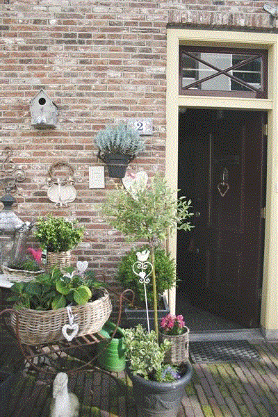 与入户门相连的墙面可以钉几个铁艺花托来放盆栽点缀装饰,搭配小巧的鸟巢、精致的烛台,把门口墙面也装点成一道风景。