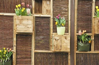 由木条和藤条组成的景观墙,设计凹凸造型的小木箱或收纳格,摆放小型盆栽或插些鲜花,给墙面带来别致的风景。