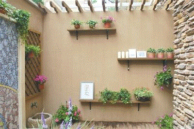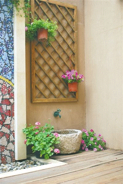 定做一面木格栅挂在墙上,种些攀爬植物缠绕在木格栅上或将小型绿色盆栽挂在镂空的格子上,无论是赏花观叶,都别有情调。