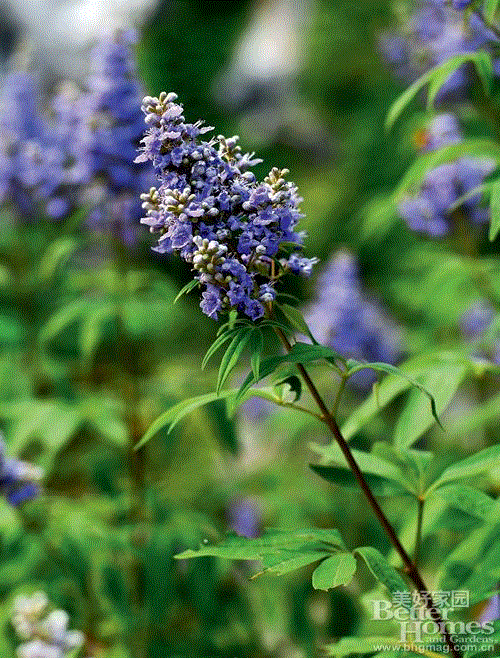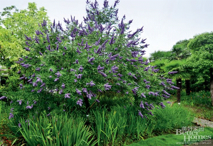 穗花牡荆(Vitex agnuscastus L)原产于山东、江苏和上海的色彩。另外,这些常绿灌木也可以弥补穗花牡荆冬季落光叶子后的缺憾。 一带的山区野外,因此非常适合这一带的种植气候,不过在高温潮 湿的江南夏日,它也能生长得很好。当夏日的大地被太阳烘烤得滚 烫,炫目的阳光刺得人睁不开眼睛,这时突然看到远处一片极其浪 漫的蓝紫色,刹那间,你会感受到一阵沁人的清凉。穗花牡荆有着 蓝紫色的聚伞花序,呈圆锥状排列,花序长8cm~18cm,盛开在每 根枝条的顶端。花的大小形态与同为灌木的醉鱼草十分相似,但是 前者的花量更大,整体株形也比醉鱼草要好很多。尤其是在恰当的 修剪之后,整棵植株就如一把蓝紫色的大伞,在一片绿茵的夏日庭 院里显得分外突出。