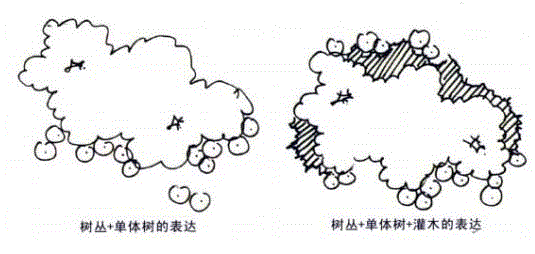 (2)单体树。快题考试中的树木通常直接用大小不一的圆圈来表示,大乔木的树冠大小以5-6m为宜,小乔木的树冠以3-4m为宜,对于需要重点描绘的捌术可以选用一些较优美的植物平面图例来表示。