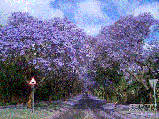 南非的约翰内斯堡拥有世界上最大的人造森林,超过一千万棵树生长在这个南非最大城市。世界上有至少49种蓝花楹,其中大部分原产于南美和加勒比海地区。图中的蓝花楹隧道位于比勒陀利亚,当地拥有70000多棵蓝花楹,盛开时使整个城市到处呈现出绚烂紫色和蓝色。