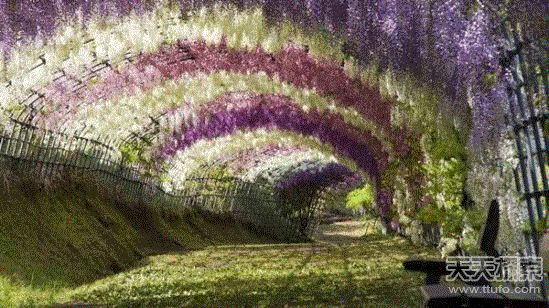 鲜艳繁盛的紫藤花盛开在日本北九州的河内藤园。樱花季节过后,随之到来的是紫藤花,其枝蔓如同葡萄藤。每年的紫藤节日,东京、静冈和冈崎都会隆重庆祝。足利花卉公园是欣赏各种不同品种紫藤花的最佳场所。
