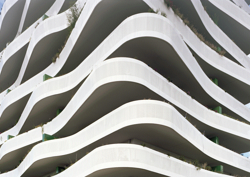 项目包含两种结构,一个高一些、一个长一些。该项目由101套私人公寓和40套社会保障性住房组成。楼面在水平与竖直面上都是起伏的,出挑结构的悬挑距离从起居室到卧室、卫生间逐渐缩进,呈现出波浪状。因此,项目各层交替布置就是为了避免相临阳台之间的影响。