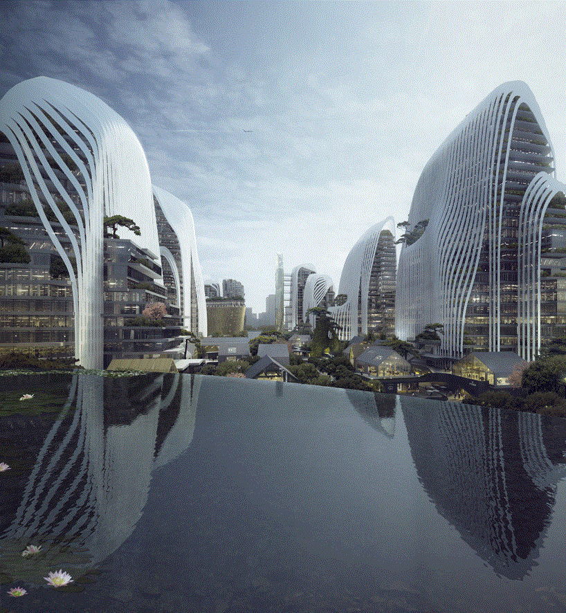 基地的中心区域由一些散落在绿毯上的坡顶小屋构成,呈现出小村落式的环境,为大尺度的城市项目提供了宜人的城市空间。小桥连接着村落,从一个街区到另一个街区,串联了假山、流水,构成了一幅充满诗意的画作。建筑采用混凝土作为材料,表现出材质本身的朴素。