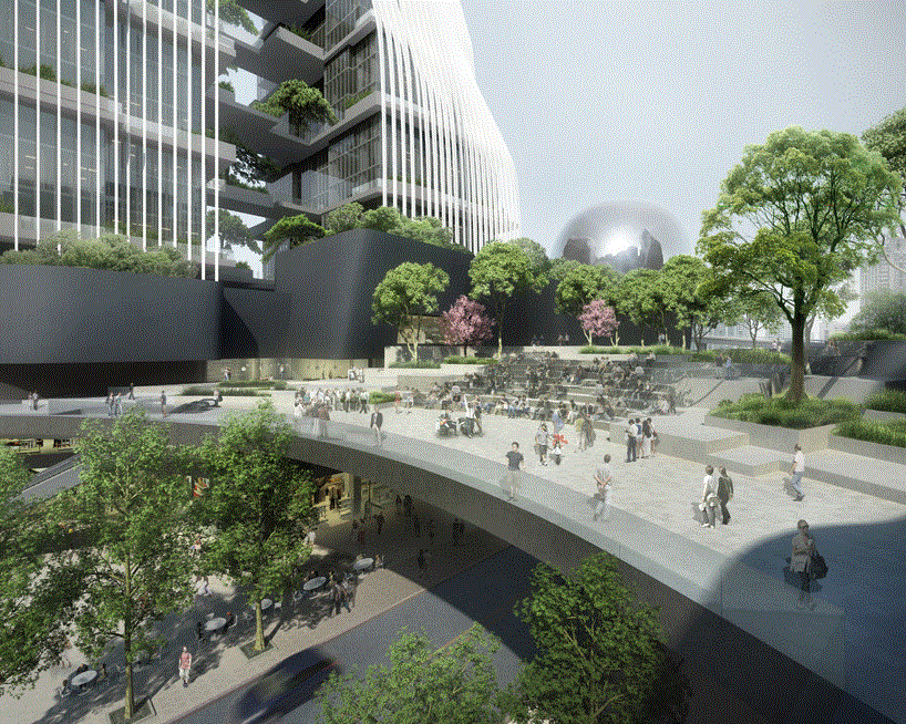 项目基地由六个地块组成,其中两个街区被一座立体城市广场连接。不同尺度的连廊、走道穿插在几个连绵起伏的商业综合体中,引领人们从繁忙的地面街道漫步到立体公园,游走于建筑与景观之间。整个建筑综合体建筑面积56万平米。