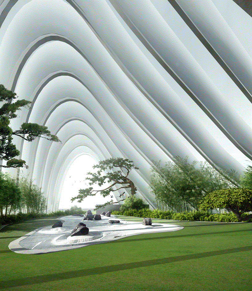 该方案将大型建筑与宁静沉思的花园统一到一起