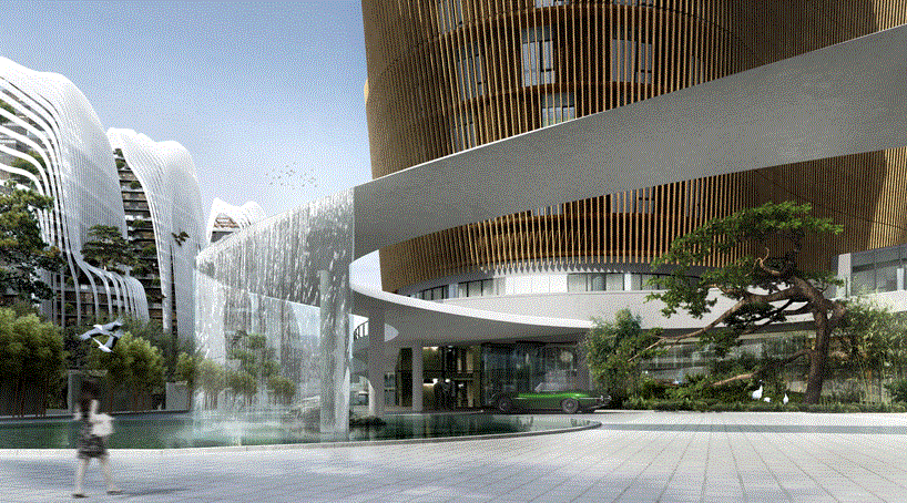 位于基地外侧的塔楼宛如高山,竖条的遮阳玻璃百叶,遮阳又透光,为室内空间提供了怡人的光线和风,如瀑布般流动于山体上,让整座建筑充满意境。塔楼扮演了高山流水的远景,而基地内水池、瀑布、溪流、水潭等的水景承接了意象并把隐喻具现化,模糊了远景与近景的边缘。这些项目内的水景同时也是雨水收集池,让基地内的水再用于浇灌,循环利用。