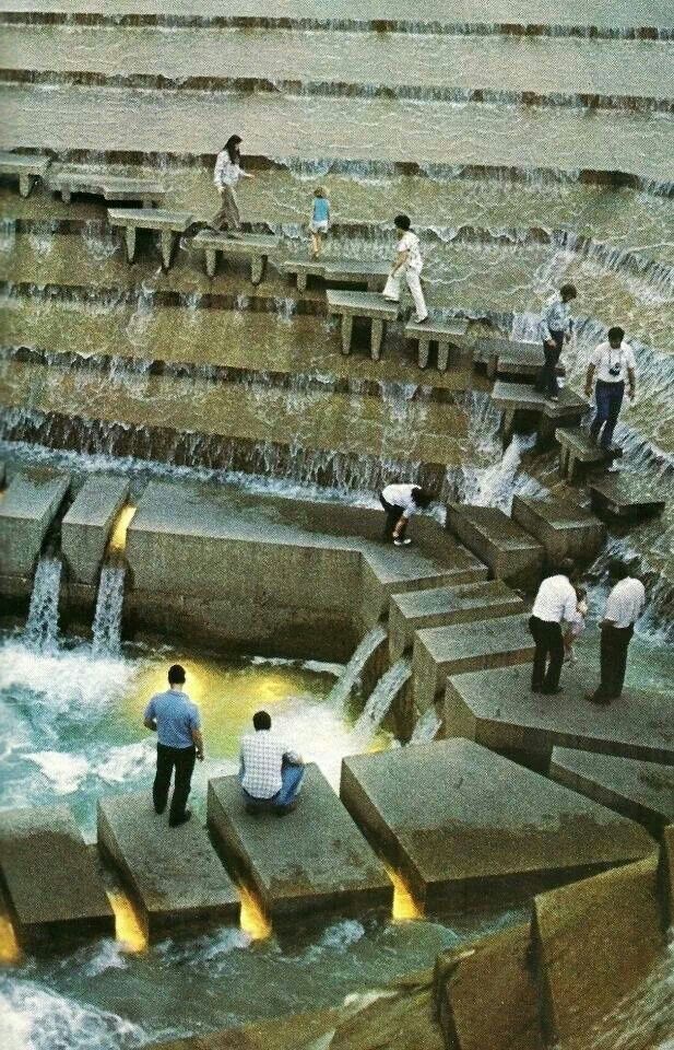 瀑布与建筑,层次感的景观设计与动态的水体,吸引了不少人群的游戏参与,能让人群快乐的景观设计绝对是值得称赞的!