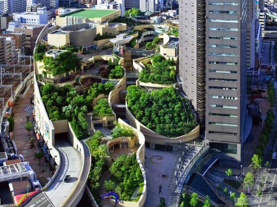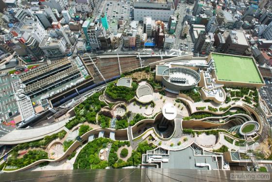 当我们想到购物中心,典型的形象可能是一系列互相关联的建筑体量,它们一般用作餐饮之用,人们对于购物中心最感兴趣的部分,也许就是这里的。Namba公园,位于日本大阪,是一座巨大的零售和办公相结合的综合体,它完全突破了人们心中的购物中心的摸样。它建造在大阪棒球体育场旧址之上,于2003年由Jerde Partnership设计完成。它的独特之处便是设计了一座八层的屋顶花园,屋顶跨越几个街区,形成了树园,岩石集群,峭壁,峡谷,草坪,溪流,瀑布,池塘,甚至是蔬菜种植园。