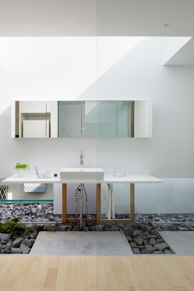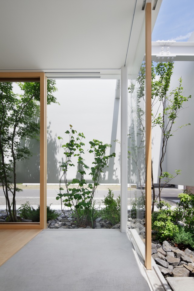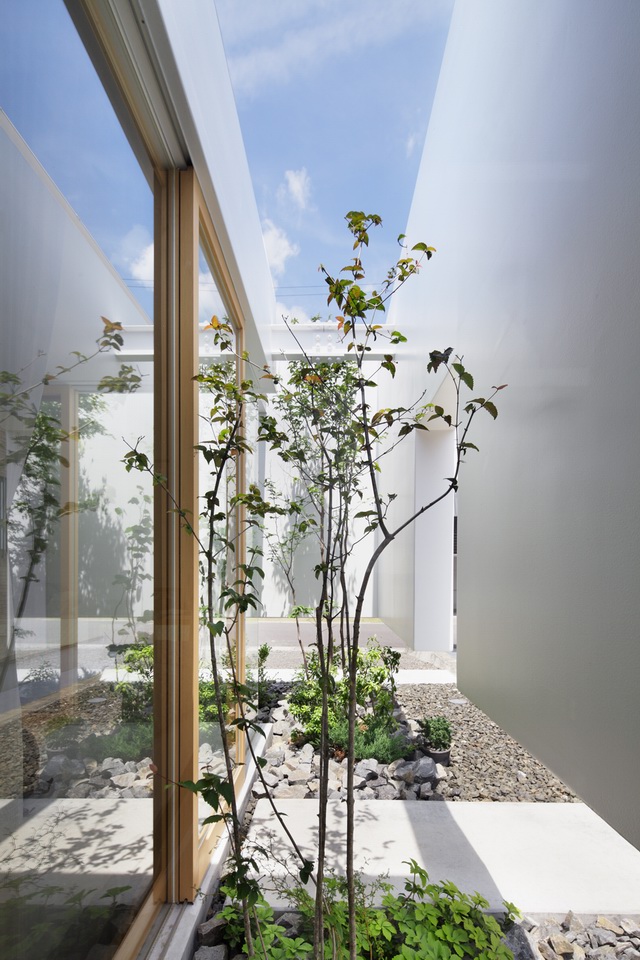 虽然住宅四周被白白的墙面包围,然而在白墙的立面却围绕了一圈种满绿色植物的“景观带”。而白墙并非顶天立地的矗立在建筑周边,而是上有天堂,下有地的悬在半空,阳光可以通过顶部射进四周的天井,提供给室内均匀的漫反射光线。同时产生空气流通。