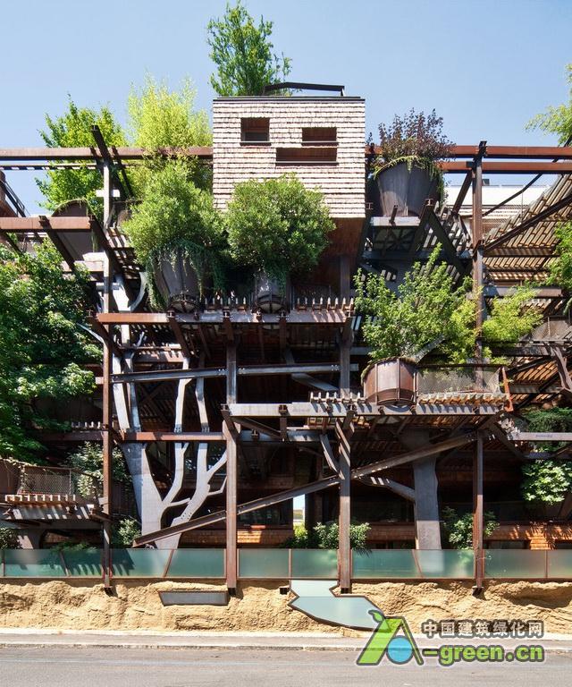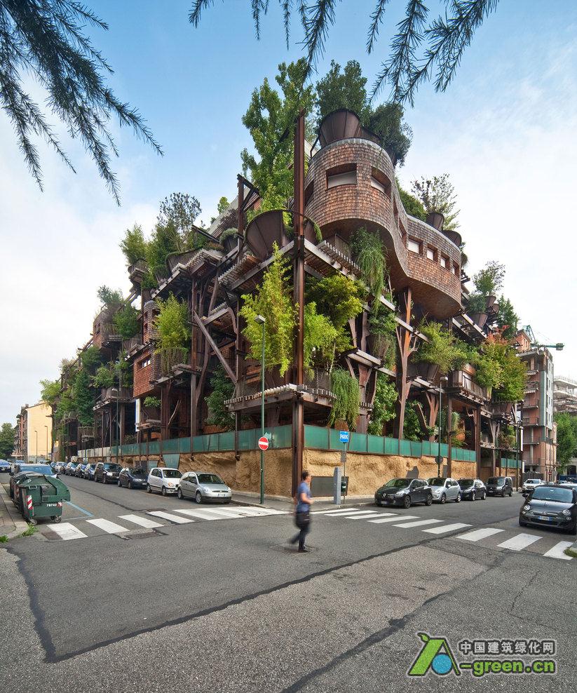 Luciano Pia工作室,25 Verde 由锈蚀的钢铁作为起结构骨架,150棵树木穿插在骨架中类似大花盆的固定位置,水体穿插于步行道间,屋顶设有郁郁葱葱的花园。整座建筑犹如一座现代城市中的机械森林,它是可呼吸的,并会随着时间的变迁呈现出不同的样貌。建筑中的植物成为调节内部微环境的关键,可以有效地屏蔽城市的噪音与烟尘。