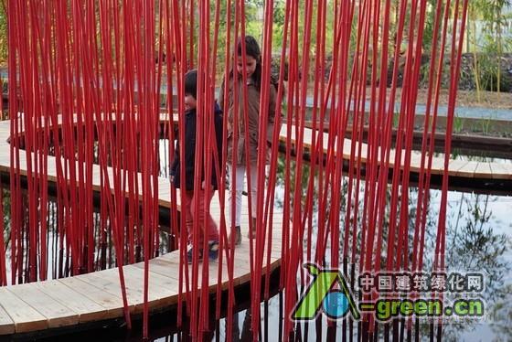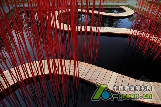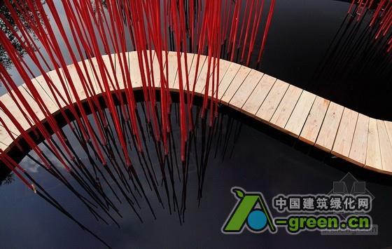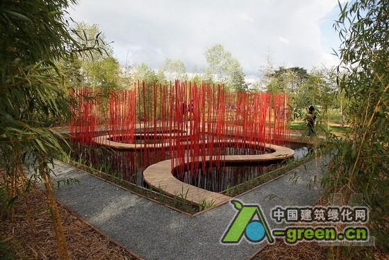 借鉴中国传统园林中师法自然的手法,“方与圆”阐述了一种超越了100平方米所能承载的生态极简主义美学。夏季开花的中国莲将雨水很好地蓄留在洼池中,项目中,中国植被的应用营造了一个兼具感觉与物质层面的宁静空间。竹子的分支被视为场地边界,并且在场地中收集和重复利用,红色的竹竿沿着曲线路径(象征“圆”)反射在池面上。结合垂直的竹竿,不仅营造了跨越水面对角线的路线连接,也提供了中国古典园林中所倡导的“曲径通幽”式体验。