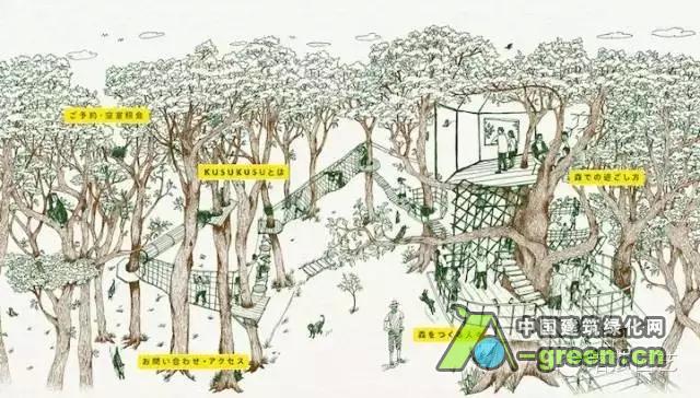 这是树屋的设计图,可以看出主要部分在300年的大树上,有两个平台和一栋小屋。而这棵树和其他树又有木头通道相连。所以它成为了日本最大的树屋。