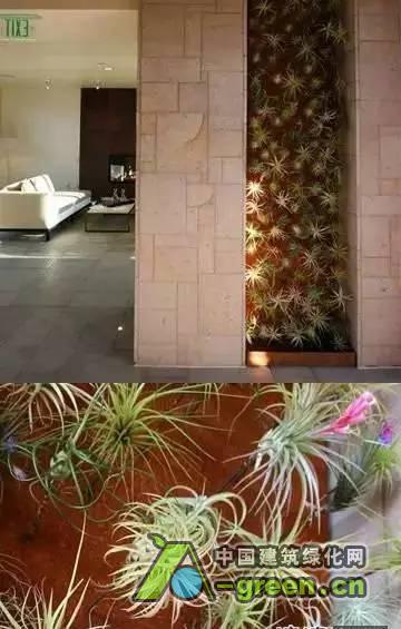 有些垂直花园甚至不需要土壤和灌溉!在加利福尼亚州Bardessono酒店中名为 “空气凤梨”的垂直花园顾名思义只需空气无需土壤就能成活,净化空气的同时也成为了酒店室内独特的装饰,与金属边框结合,为古铜色墙面提供了立体的视觉装饰,它们不需要大面积的灌溉,只需要不时用水壶喷雾“滋润”即可。