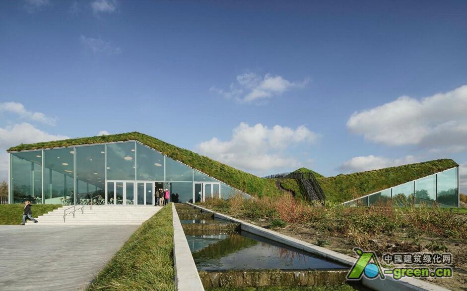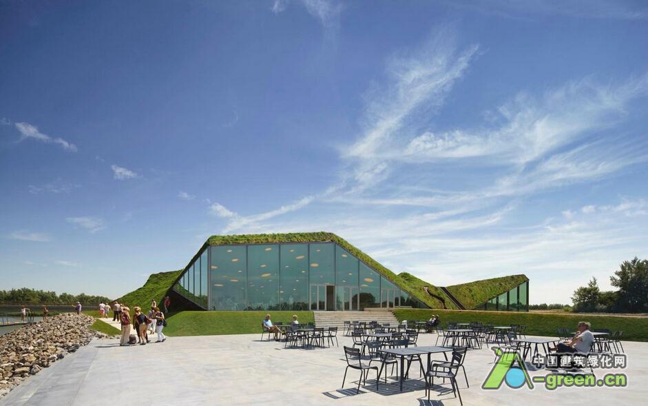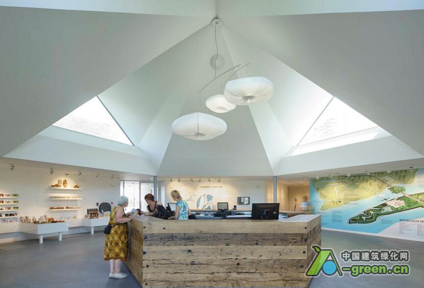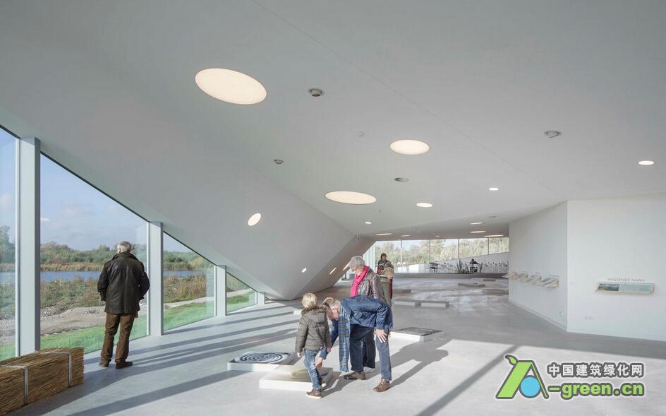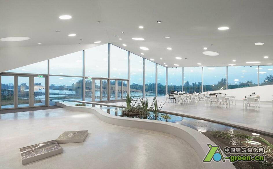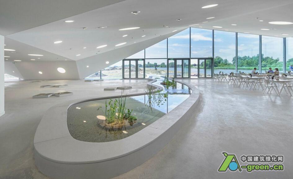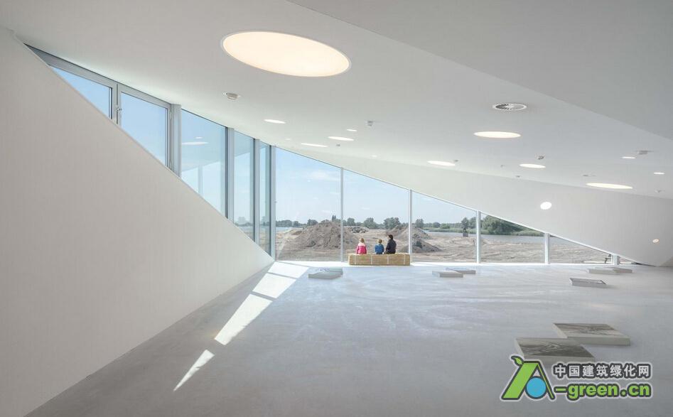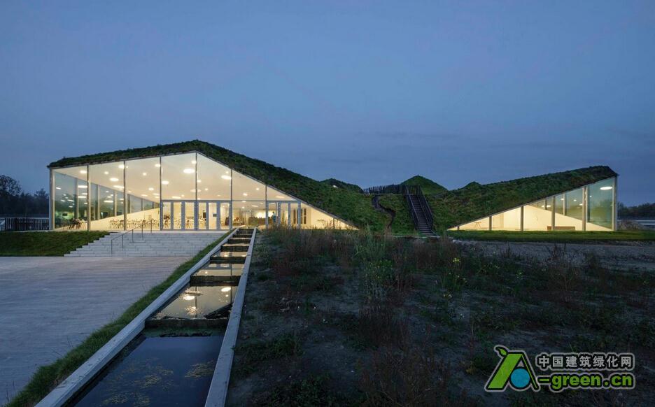经过八个月的整修之后,建筑保留了原有的六边形结构,在西南侧增加了1000平米的翼楼。以大面积开窗为特征,翼楼向博物馆花园敞开,包括一个可以欣赏到周边水域景观的有机餐厅和一个临时展览空间。博物馆的新老建筑都被土垒包围着,屋顶覆盖了绿草和植物。屋顶雕塑般的形态像艺术品一般增加了该地区生态价值,在周围景观映衬下显得非常突出。新翼楼和现有的体量都在最大程度地减少能源消耗,配备了最先进的耐热玻璃,不必要安装百叶窗。西北侧的土垒和绿色屋顶起到绝缘层和热缓冲的作用:在寒冷的天气里,生物质炉灶通过地板加热维持在舒适的温度上;在炎热的季节里,河水通过同样的管道使建筑降温。这是荷兰首个通过柳树净化生活污水的项目,柳树吸收废水,废水中的氮和磷酸盐作为营养可以促进柳树成长。水经过净化以后流入邻近的湿地,最终流入河流。如果柳树被锯掉或干枯而死以后,木材可以作为博物馆生物质炉具的燃料或用于其他目的。