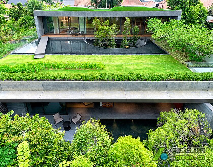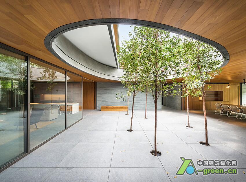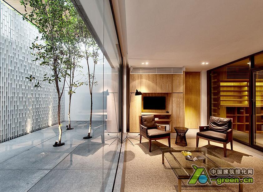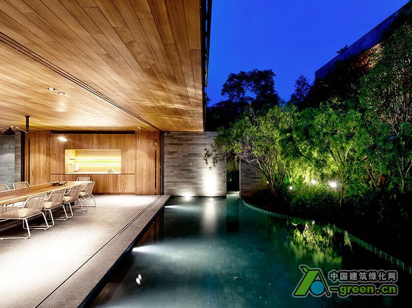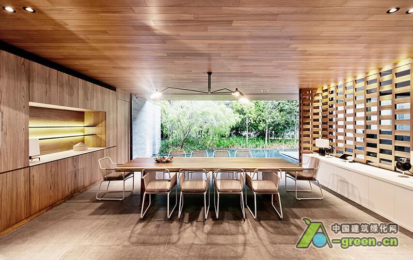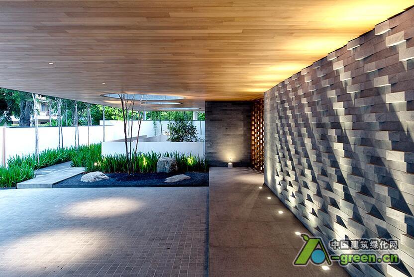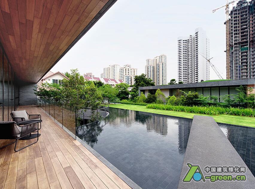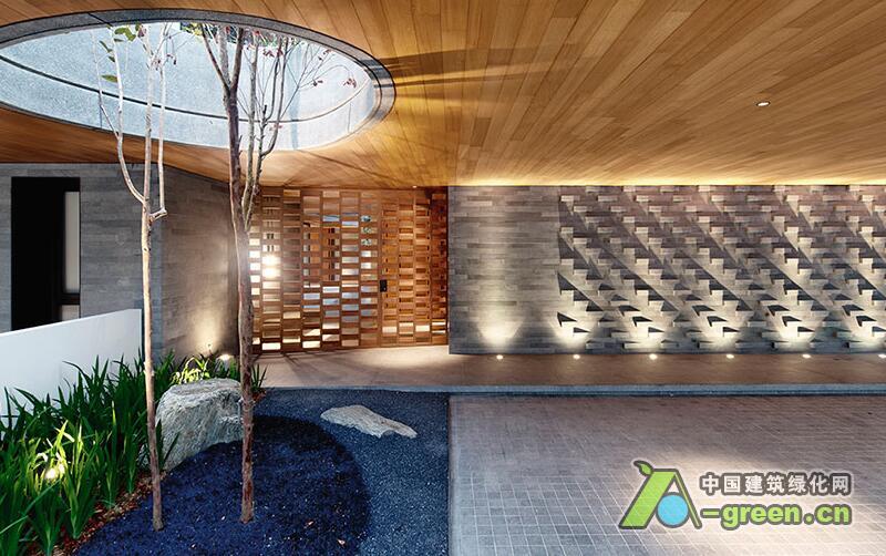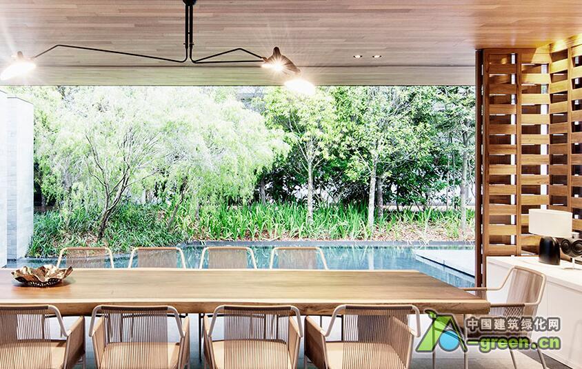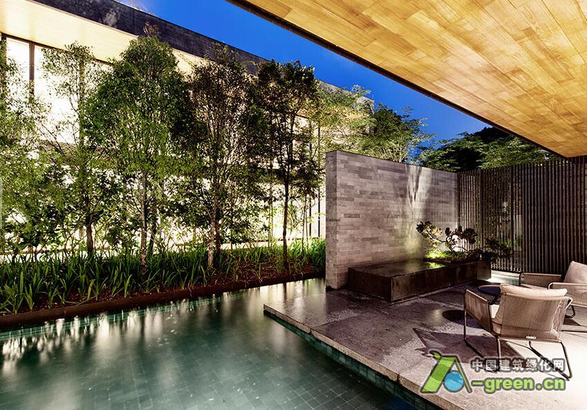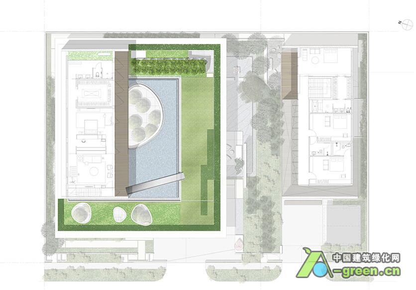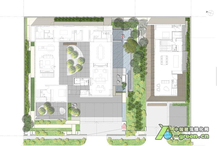 在该项目中,景观设计师借鉴中国传统园林中借景的手法,强调人与自然共生共融,通过植物与空间的分割,既保证了两户住宅的隐私性,同时也让双方有比较通畅的视线。中间共享的庭院消除两院之间的边界线,又使两个空间相互延伸,增加视线和空间的层次,最终在一个相互依存的景观里形成丰富的空间深度感。