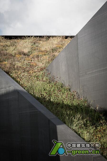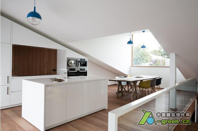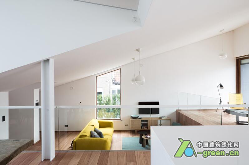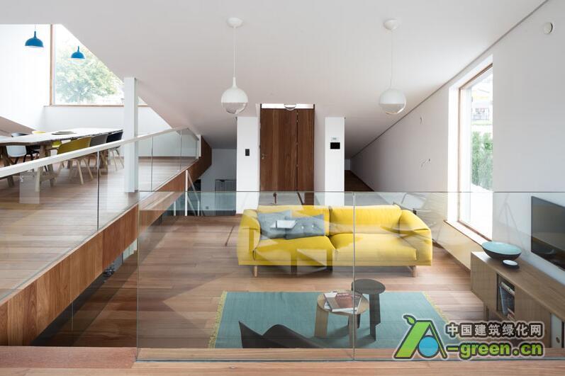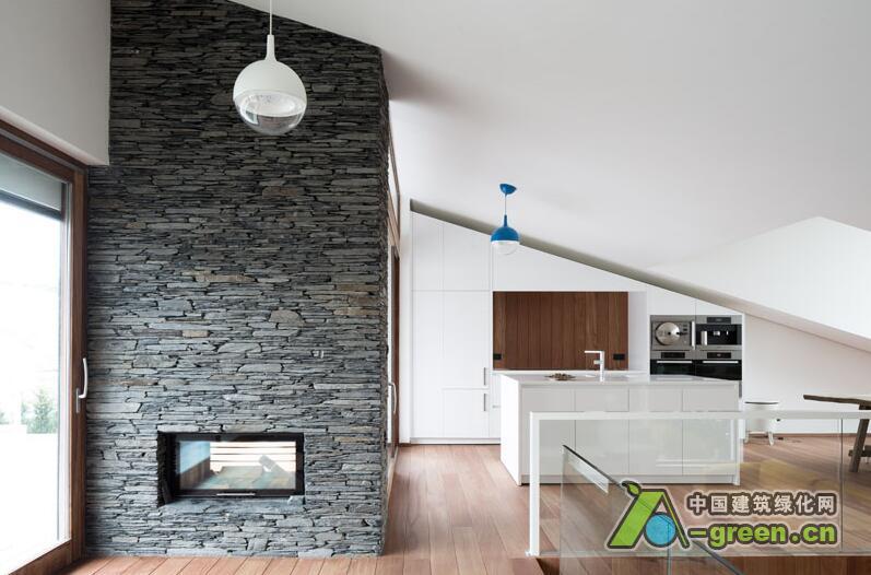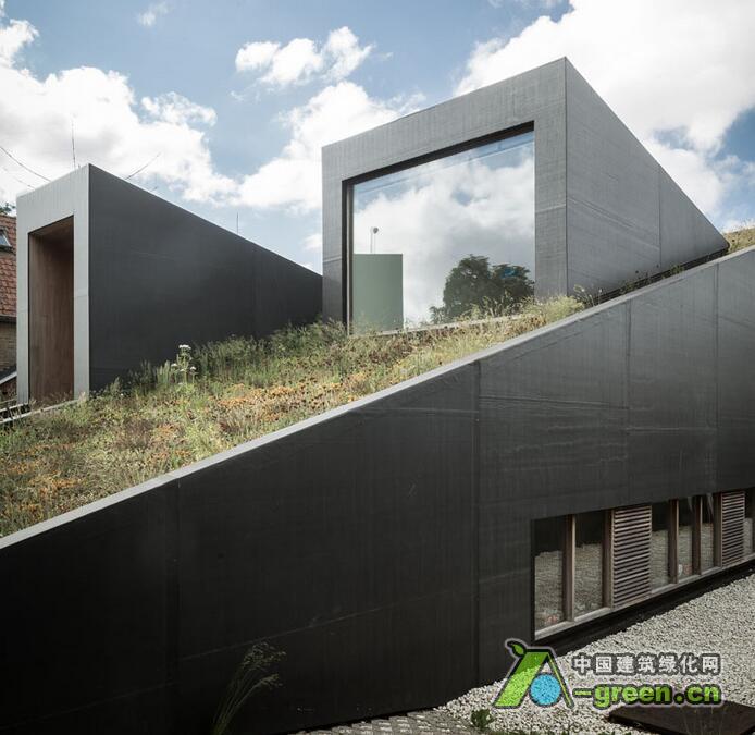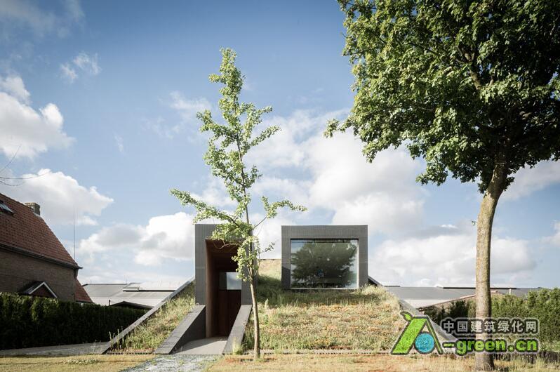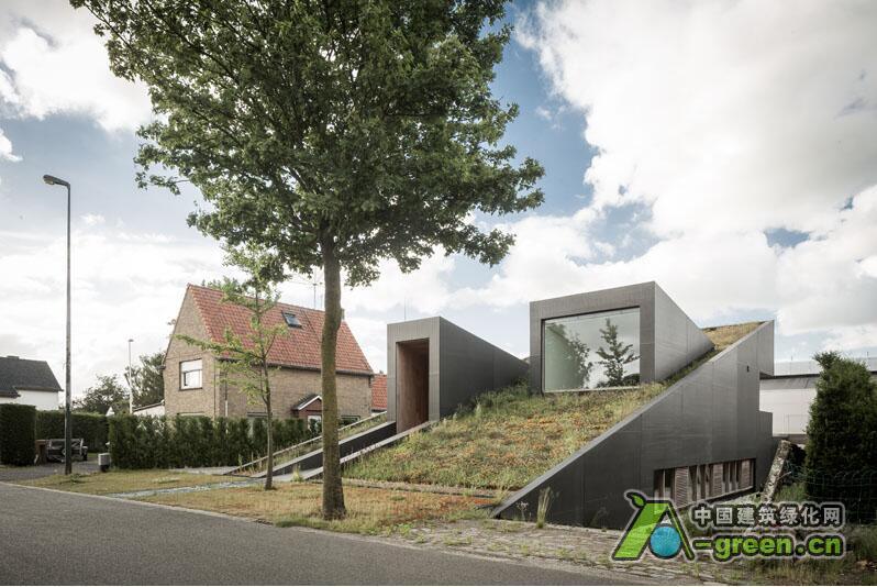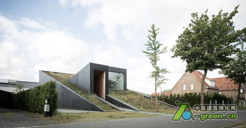OYO architects事务所在比利时建造了一座房屋,其中的一部分位于地下。 该房屋形状奇特、建造绿色屋顶,从路面一直倾斜向上。整个房屋覆盖着一层橡胶防水层,保护其不受天气变化的影响,并构成一个立面元素。 其绿色屋顶和太阳能电池板为该房屋节省能源。设计师使用木头和保暖材料营造斯堪的纳维亚氛围。黄蓝搭配增添了起居室色彩。室内外都能使用壁炉:夏季用于户外烧烤,在遮蓬阳台上用餐;冬季用于温暖房屋。 餐厅旁设有大型窗户,室内阳光充足。