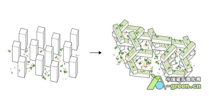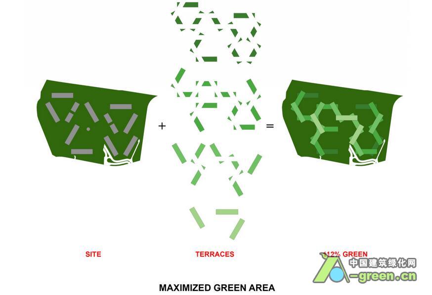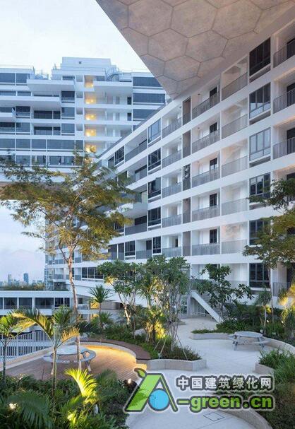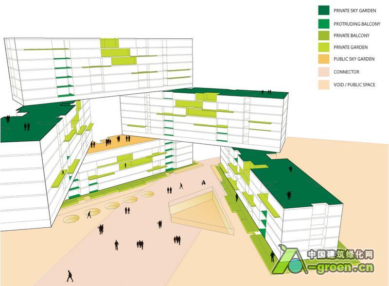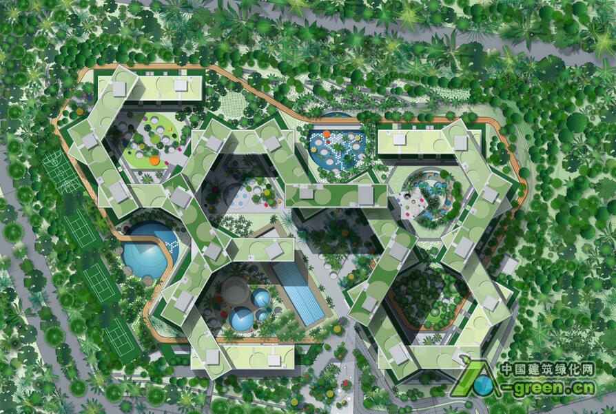 该项目以现代化竖立式村庄为创作蓝本,探讨热带居住空间的可能性,提出一种与自然环境协调并注重交流互动的生活方式。项目包括31个公寓单元,每个六层楼高,以六边形格局叠加组成,采用横向堆叠结构,每一阵列楼层堆叠到另一阵列楼层上,同时构成六个超大尺度的通透庭院,其交织的空间形成空中花园、私人和公共屋顶平台,提供休闲娱乐场地。设计利用基地的大尺度,通过开阔的屋顶花园、具有热带景观的天台和层叠的阳台增加绿色自然环境,同时减少地面的车辆流通,使项目的绿化面积达到最大化。每一幢楼的楼顶都是一个空中花园,错综层叠的设计除了提供隐私和宁静的空间,并综合风向、天气条件、绿化设计等因素,确保每家住户都拥有最佳的景观、通风和阳光,获得最接近自然的居住条件。