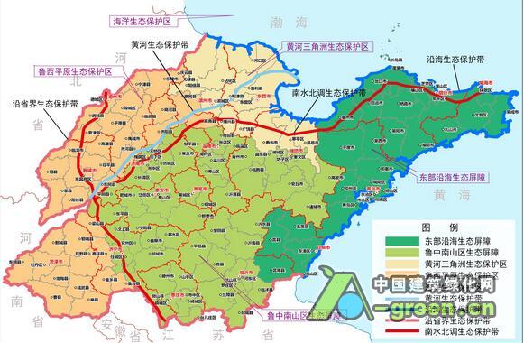 在全省生态保护与建设区域布局的基础上, 规划还确定我省生态保护与建设的重点是“两屏三区四带多点”,即:东部沿海和鲁中南山区“两大生态屏障”,黄河三角洲生态保护区、鲁西平原生态保护区和海洋生态保护区“三大生态保护区”,沿黄河、沿海、沿省界和南水北调沿线“四大生态保护带”,省级以上自然保护区、森林公园、湿地公园等点状分布的重要生态区域。