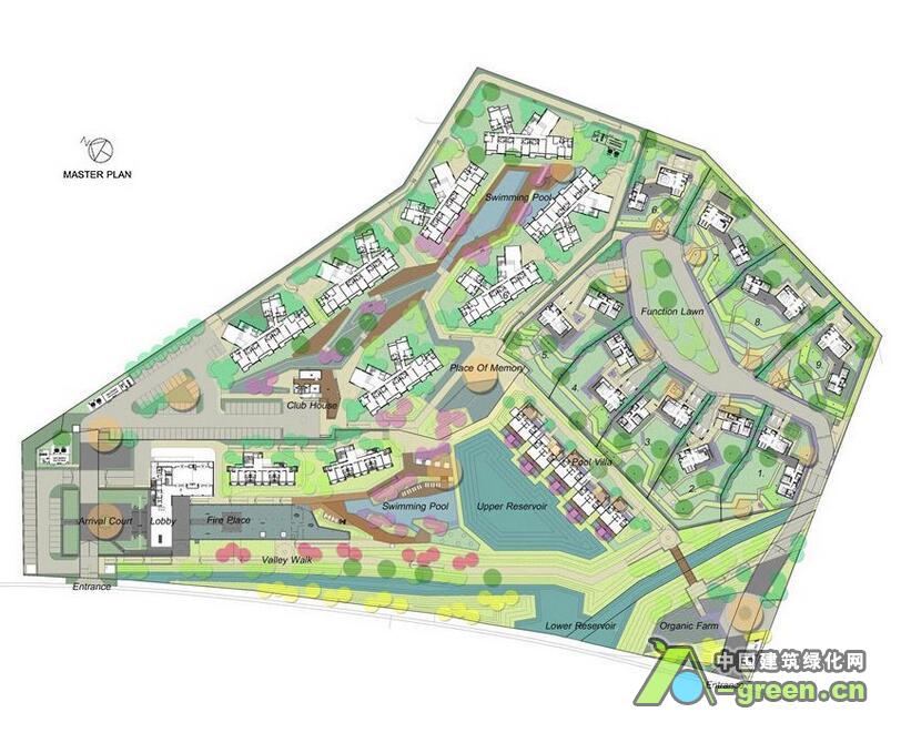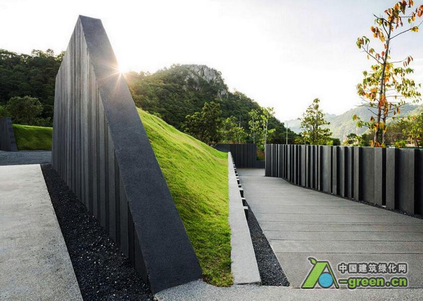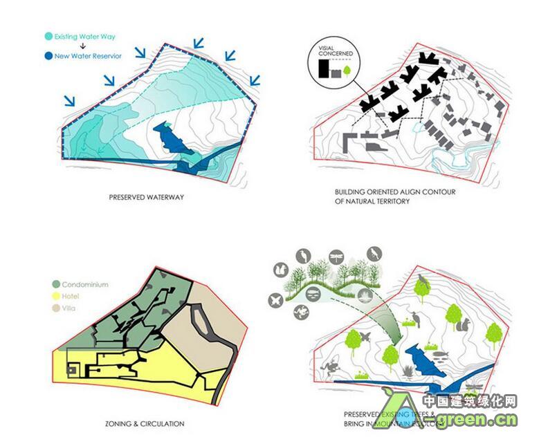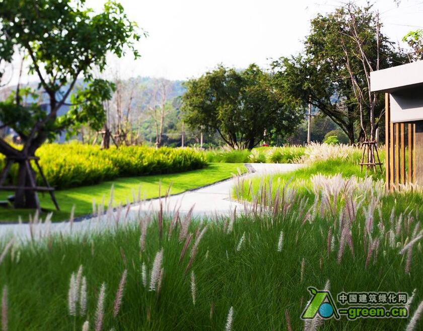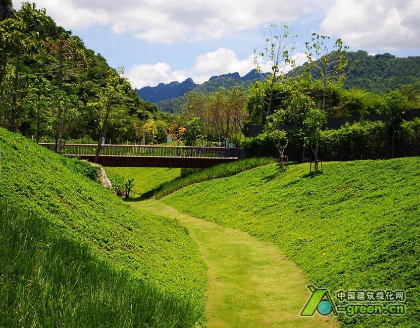 地球上的流体物质都是从高处流向低处的,也正因为这样,才形成了地球上美妙的侵蚀自然景观。该项目场地位于一片流域与陆地的汇合点,四面环山。该项目的设计灵感是从自然的侵蚀过程的特点中产生的,也成为了该项目设计中的独到之处。首先,水景就像一个水塘,渗透整片草地,附近的沙丘则就像水塘的岸边。在场地中最低洼的地带有一个大池塘,使得该项目显得更加具有自然气息,而且该池塘也可作为一个雨水储备中心,在干旱的季节可用于植被灌溉。第二,该项目设计团队在材料选用和植物栽培上花费了很大的精力,他们为该项目所选的所有植物种类皆具有很强的抗旱性,目的是最大程度的减少用水。总的来说,设计团队非常注重项目的持久性,场地的选择和景观的设计十分注重与自然的和谐,场地与周围景观的界限也没有十分明显,努力达到人与自然合二为一的设计效果。