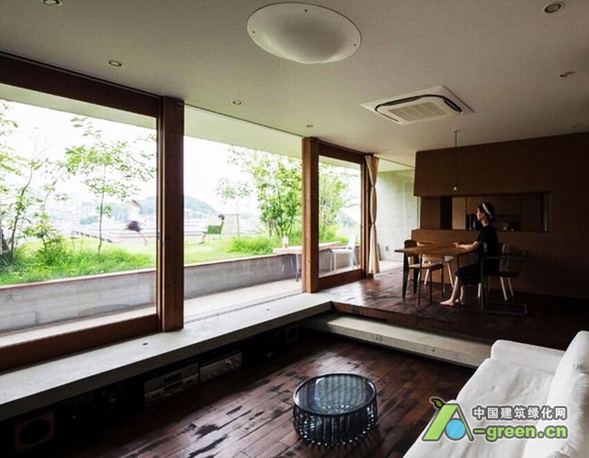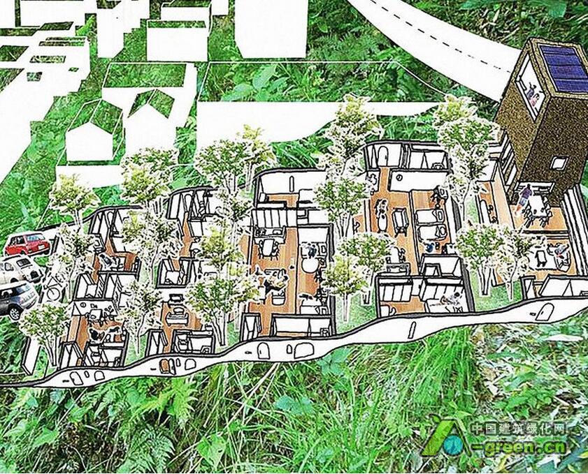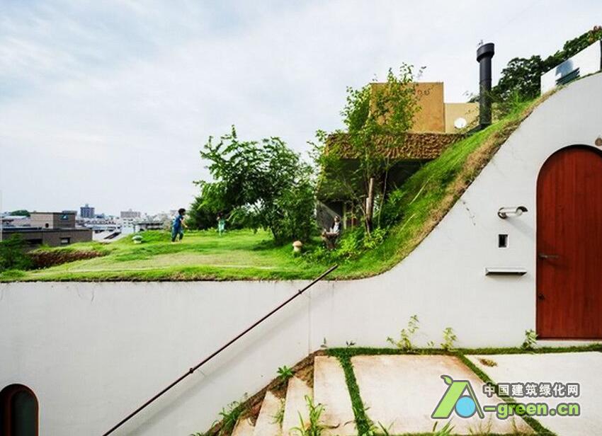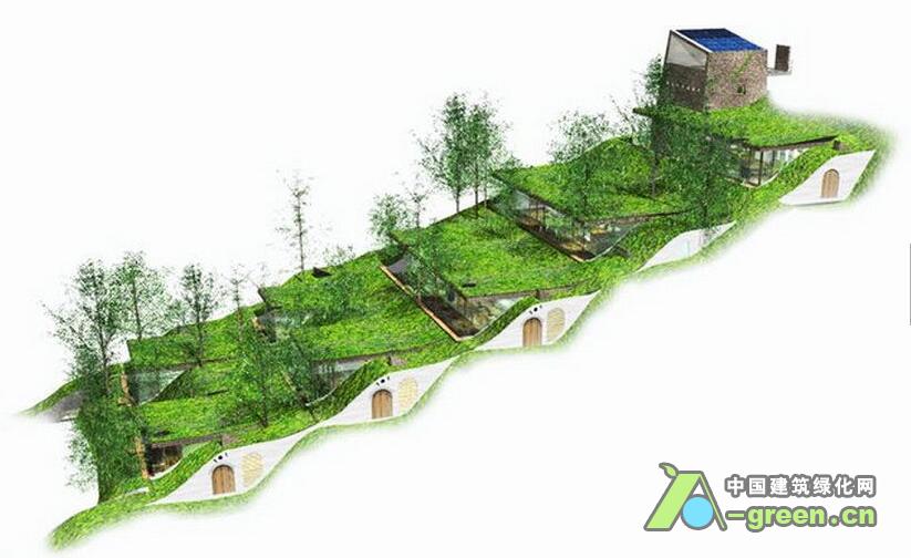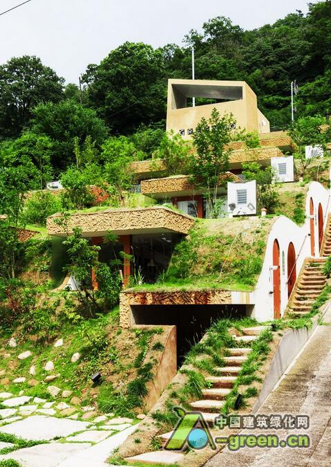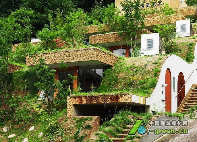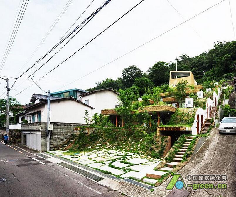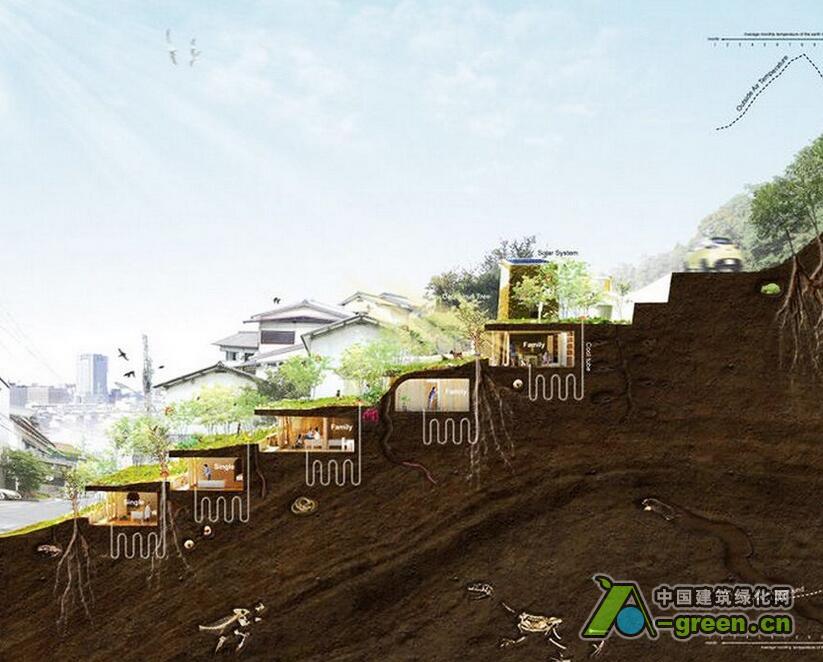 这座位于日本高松市的一处山坡上的7户住宅名为Greendo,建筑师Keita Nagata将这7户住宅小心翼翼地塞到了山体中,形成了一处缓缓的波浪屋顶,盖上草皮,仿佛这块地什么都没有发生过一般。通过对坡度的利用,使得建筑对底层土里的压力分散。而每户住宅都已半窑洞的形式嵌入山体,形成冬暖夏凉的天然隔热层。同时建筑师还通过地下连同的管道保存恒温的空气,无论冬天夏天都能为室内提供较好的新风条件。