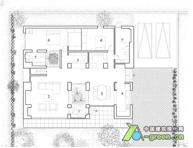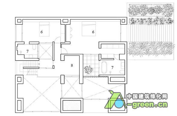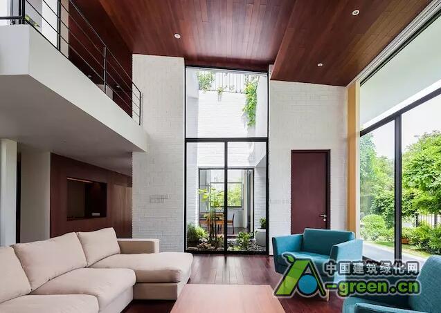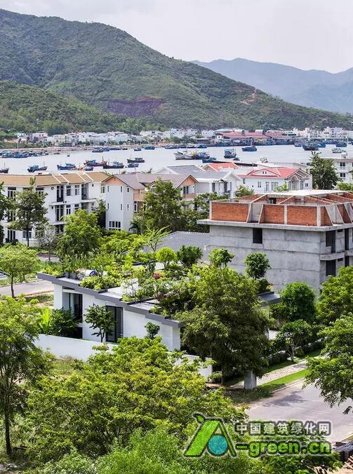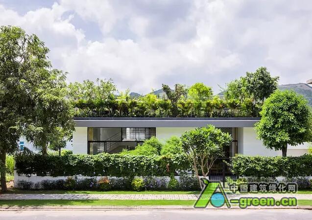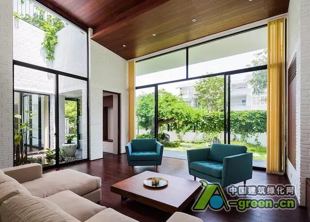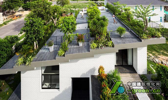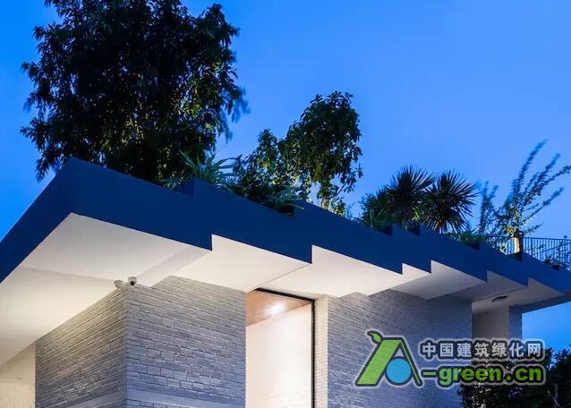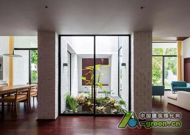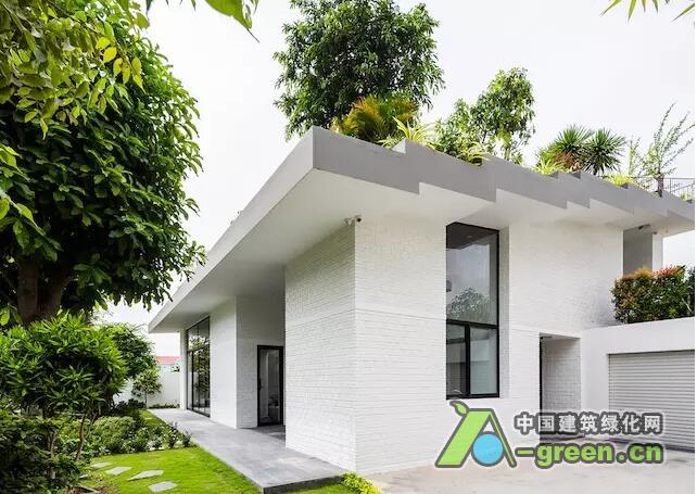 绿色植物依然能在房子内部看到,房屋中间有三处小天井,就像一个小的方形庭院,它同样有借光的作用。黑色铁框的玻璃窗是最简单的一种,光线和绿植都可以最大化看到,不会干扰到视线。如果翻看过武重义的项目会发现,几乎全部都与绿色植物有关,或者用竹子这类环保材料建造,或者在屋顶上种上绿植,而这个项目也不例外。因为场地的限制,花园就铺在了屋顶上。不同的是这一带建筑要求使用倾斜的屋顶,武重义他们就用间距较大的台阶代替,种上 4 排绿植,其余地方覆盖上传统的瓦片。从远处望去,屋顶的绿植和周围的树木连在一起,有田园的宁静安逸。室内外都使用了最简单的白色砖墙,契合乡土的气氛也带给人清爽的审美。