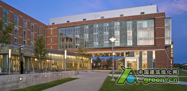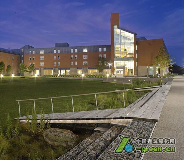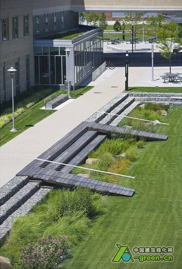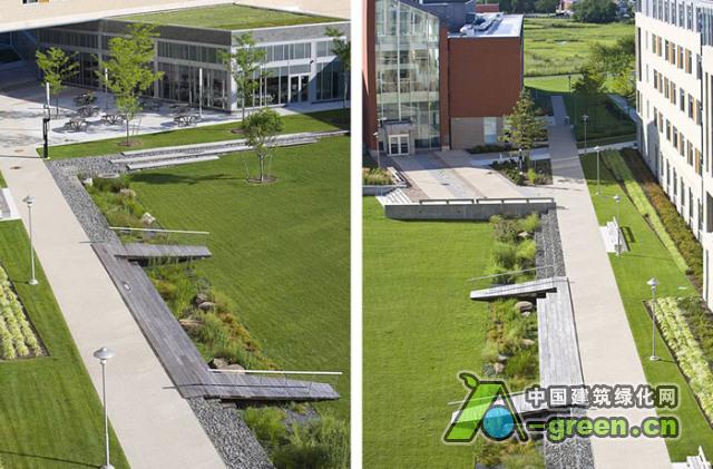 校园内这部分的开放空间非常小,校方希望建立传统的校园发展模式。因此,将“Z形”的建筑大厅改造成两个新的大院,由一个2层楼高的大门连接,面朝南部沼泽湿地。园区设计沿着一条连接庭院和沼泽的中心街道展开。之前很少使用的车辆下坡段被移除,打造成为北方四合院“绿色庭园”,可以作为聚会空间和通往大厅和食堂的主要通道。园区曾经的工业地形被保留,添加了长形板状靠墙混凝土座位,指引行人大楼入口的方向。南部“沼泽庭院”由一个倾斜的绿地休闲广场和一个180英尺长的生态草沟组成,收集园区的雨水,并汇集流向湿地。可以俯瞰到一期两条走廊一直延伸到沼泽的边缘 。