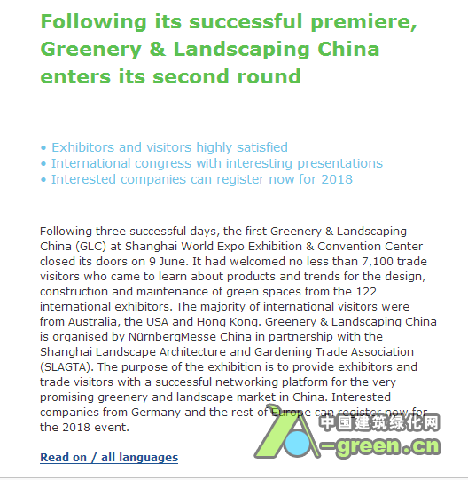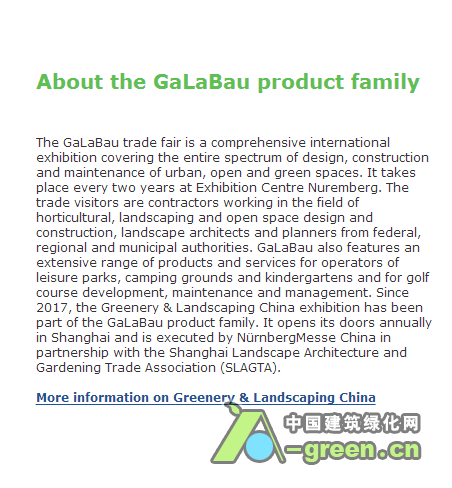 由上海市园林绿化行业协会(简称SLAGTA)自2003年开始每年主办的上海国际城市园林景观展是国内历史最悠久、影响最广的园林景观行业盛会,获得业界人士高度评价。自2017年起,SLAGTA与当前欧洲最大的专业展览会的GaLaBau(德国纽伦堡国际景观和园林展览会)的主办方纽伦堡国际博览集团(简称NMC)建立合作,借助GaLaBau的全球影响力,为展会注入最新和最高端的趋势产品与概念,重新构建中国园林行业的品牌展览会。2017年展会通过与德国园林景观承包商协会、德国园林景观建筑师协会的合作,影响力延伸到海外相关业内企业,品质和国际化程度都为历届之最。