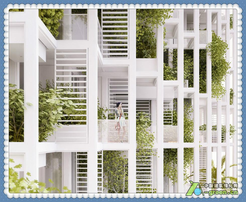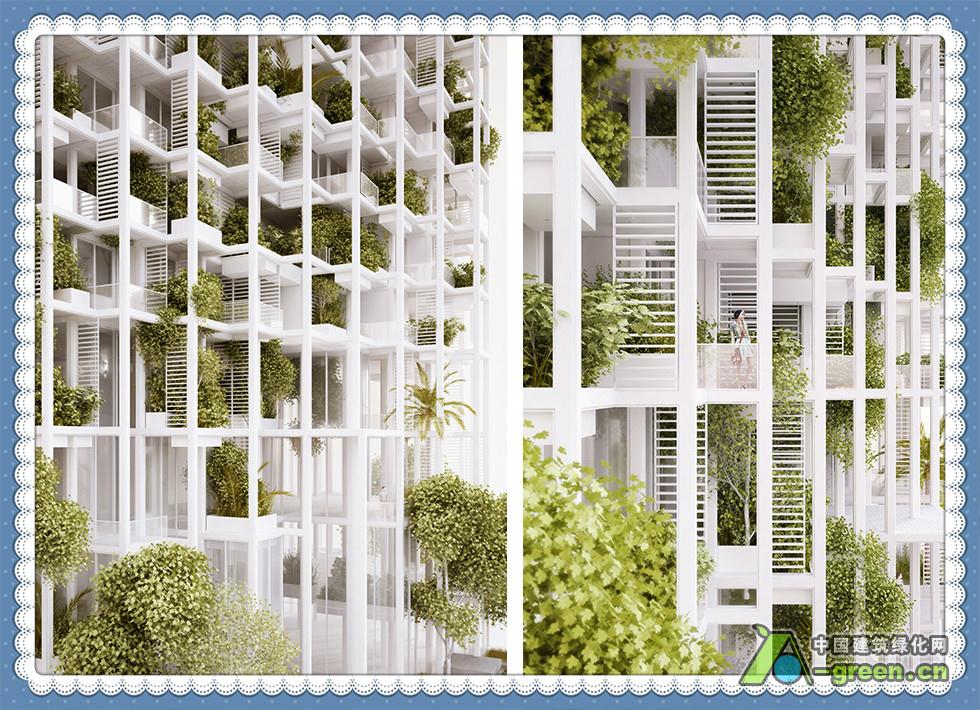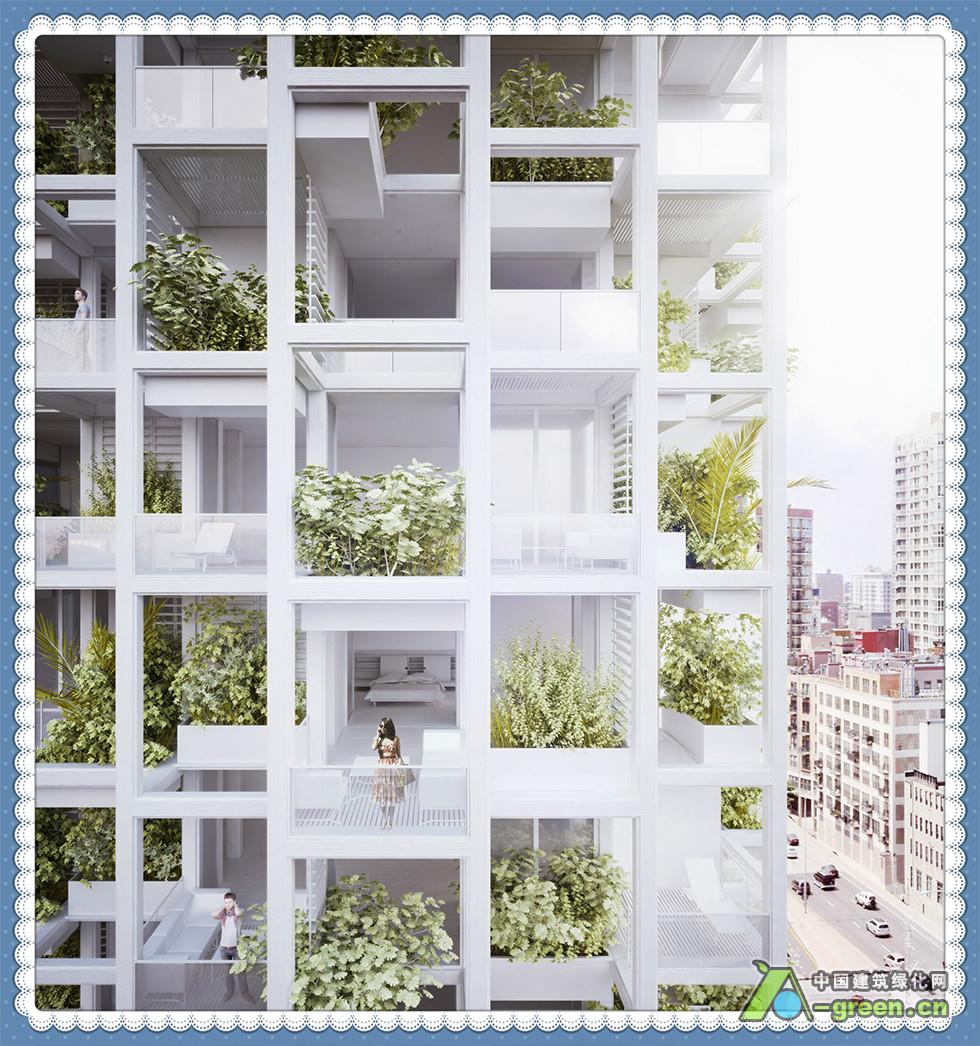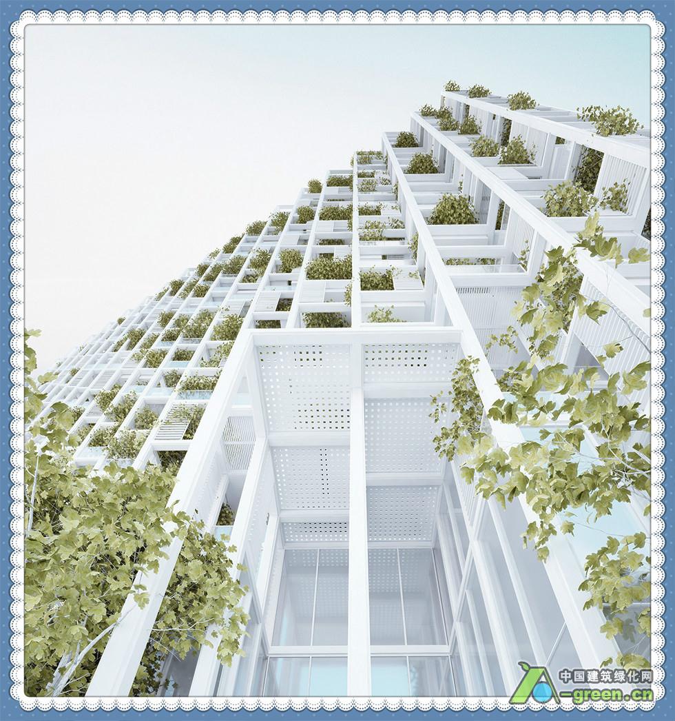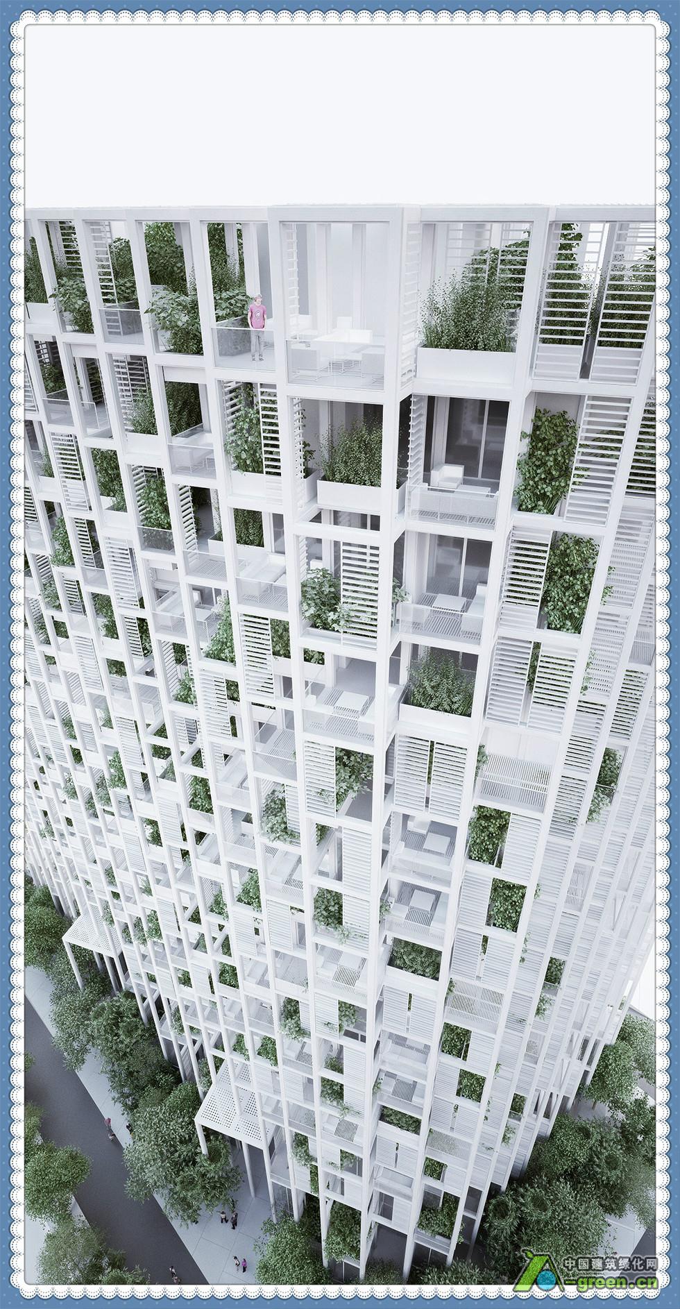 自然绿植将依附在外立面的格构进行生长,经过一段时日之后,自然绿植将成为主要的面貌覆盖于建筑表面。所以设计师也不用担心过于凌乱的客户选择了,自然绿植会有机的把它们整合起来。建筑立面充当了一个室内与室外的中间介质,净化空气的自然绿植为室内气候提供了更好的保护与调节。灰水回收系统收集屋顶的雨水和生活用水并进行二次利用来浇灌阳台的绿植。