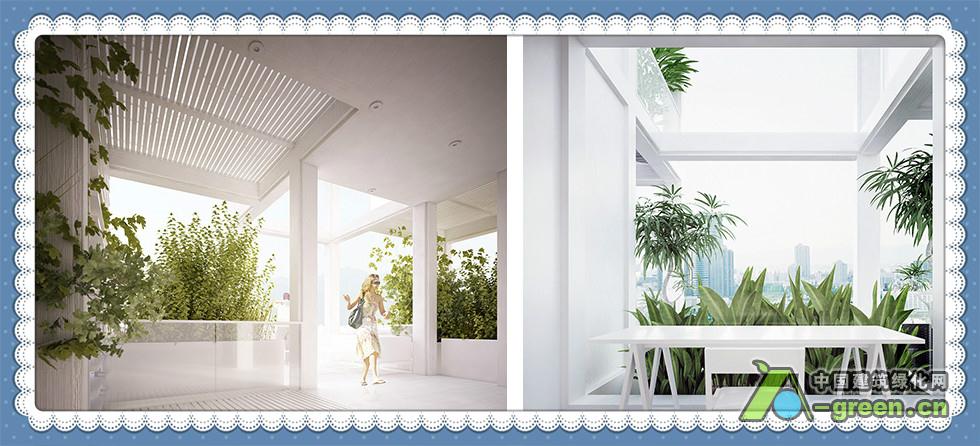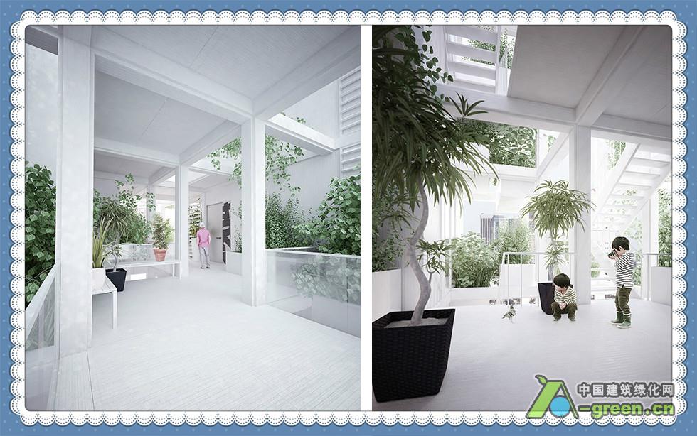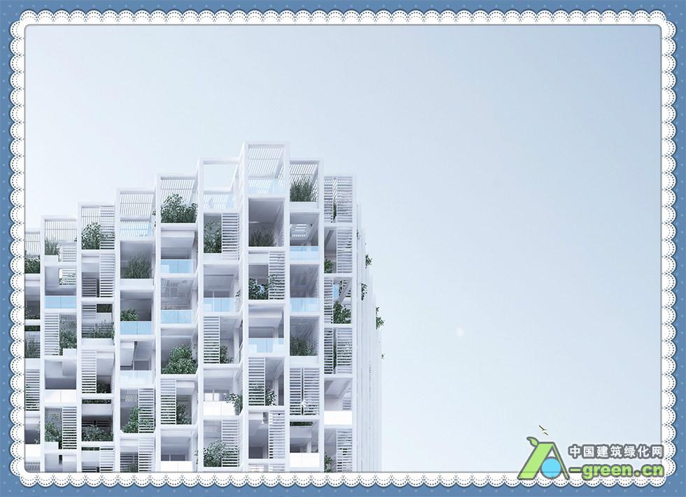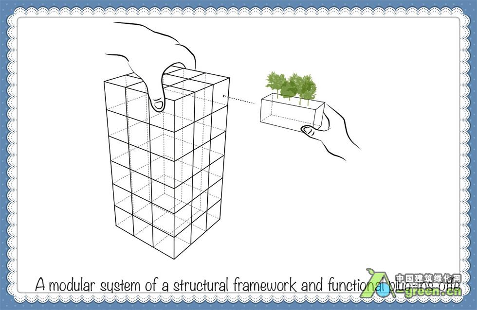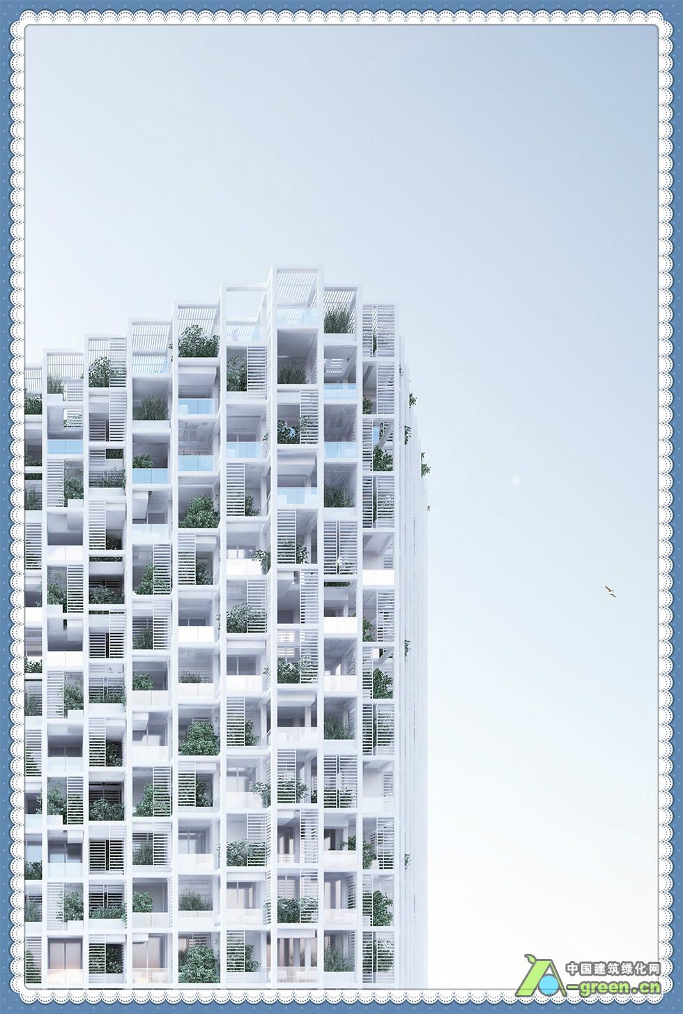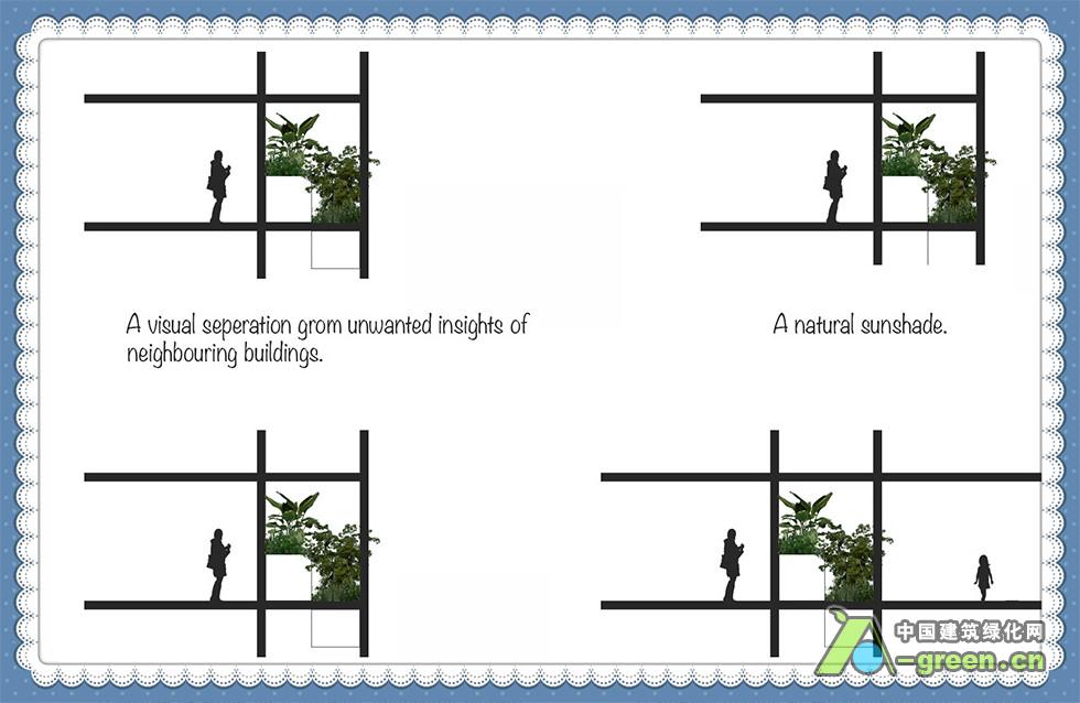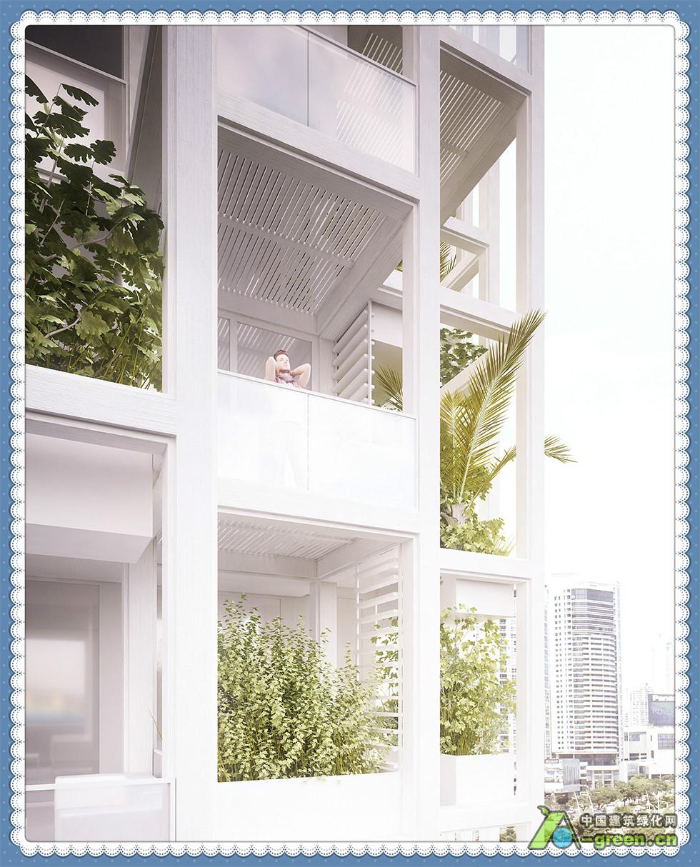 自然绿植将依附在外立面的格构进行生长,经过一段时日之后,自然绿植将成为主要的面貌覆盖于建筑表面。所以设计师也不用担心过于凌乱的客户选择了,自然绿植会有机的把它们整合起来。建筑立面充当了一个室内与室外的中间介质,净化空气的自然绿植为室内气候提供了更好的保护与调节。灰水回收系统收集屋顶的雨水和生活用水并进行二次利用来浇灌阳台的绿植。