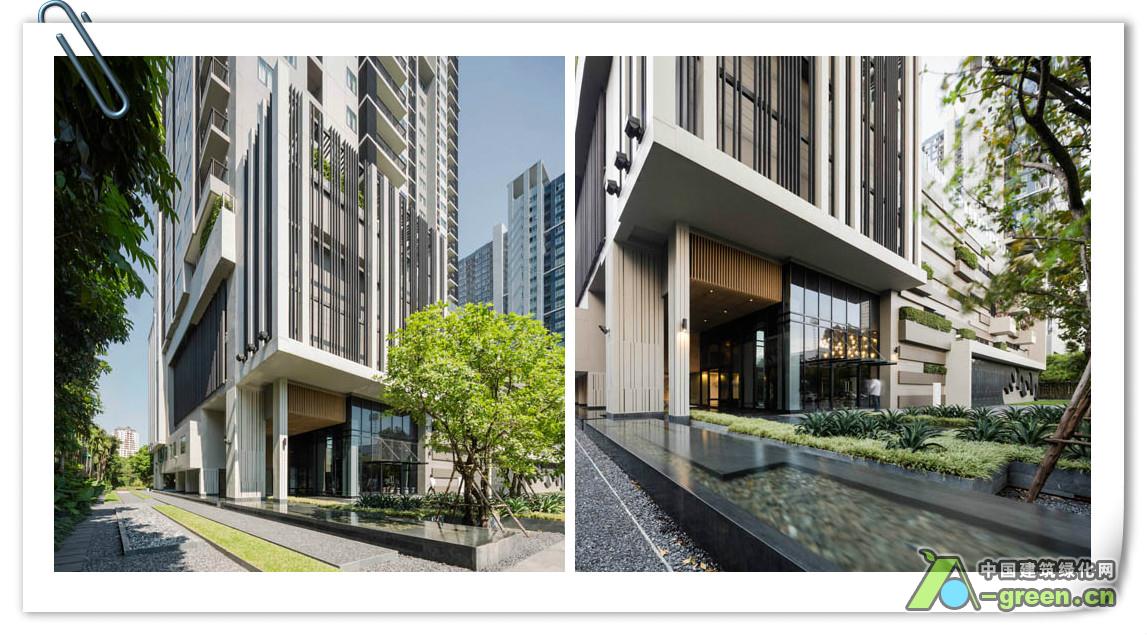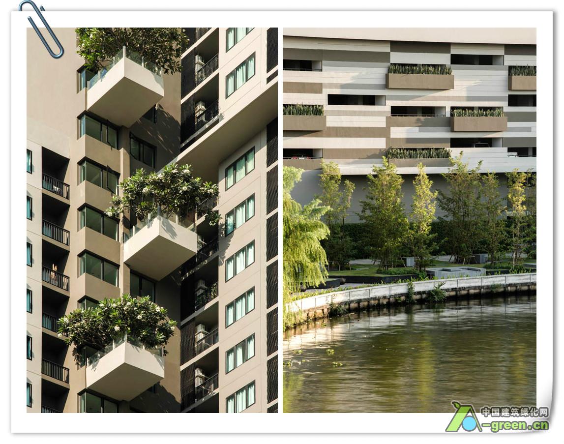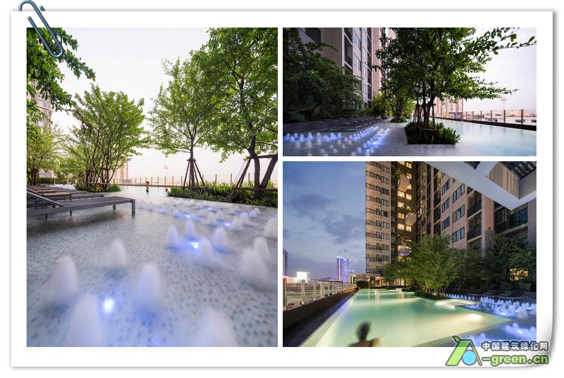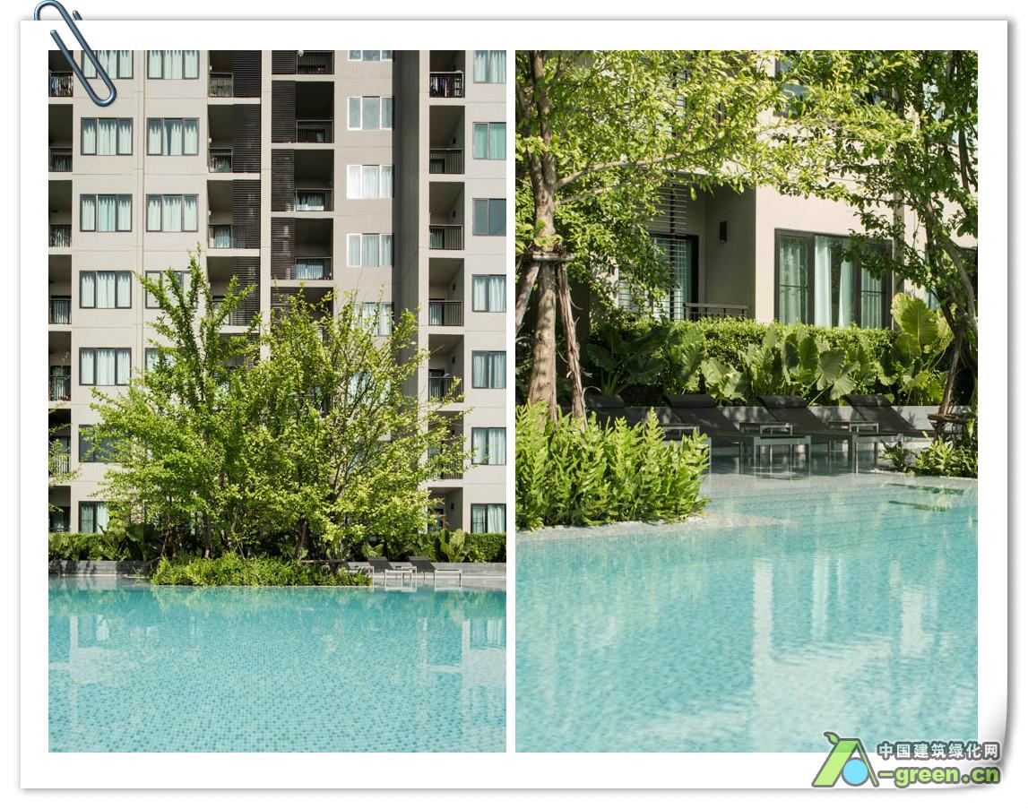 这个梦幻般的景观项目位于泰国曼谷最繁华福地的公寓中。5244平米的用地中容纳了467户住宅单元。客户希望在这个建筑项目中的一楼和五楼(带泳池)修建休闲空间。相面前方是喧闹的街道,后方是宁静的运河和住区。因为用地密度较高,项目需要在周围留出6米的消防通道和一些地面停车场,这意味着地面层有较多的硬质铺装。而高达公寓楼的外饰面也会造成城市热岛效应和炫光反射。因此设计师在地面和里面尽可能多的加上绿色。绿色从水平蔓延到垂直。地面层宁静的水池开启了绿色空间的前奏,立面上在中了植物,空中花园也种满了植物。设计师化弊为利,为居民和城市带来美丽环境。
