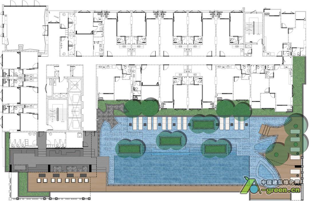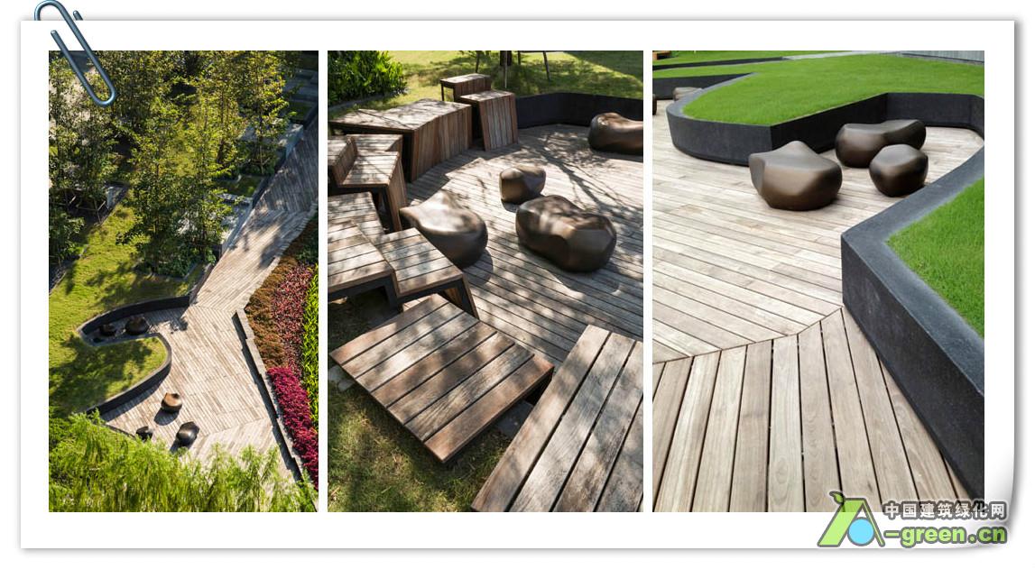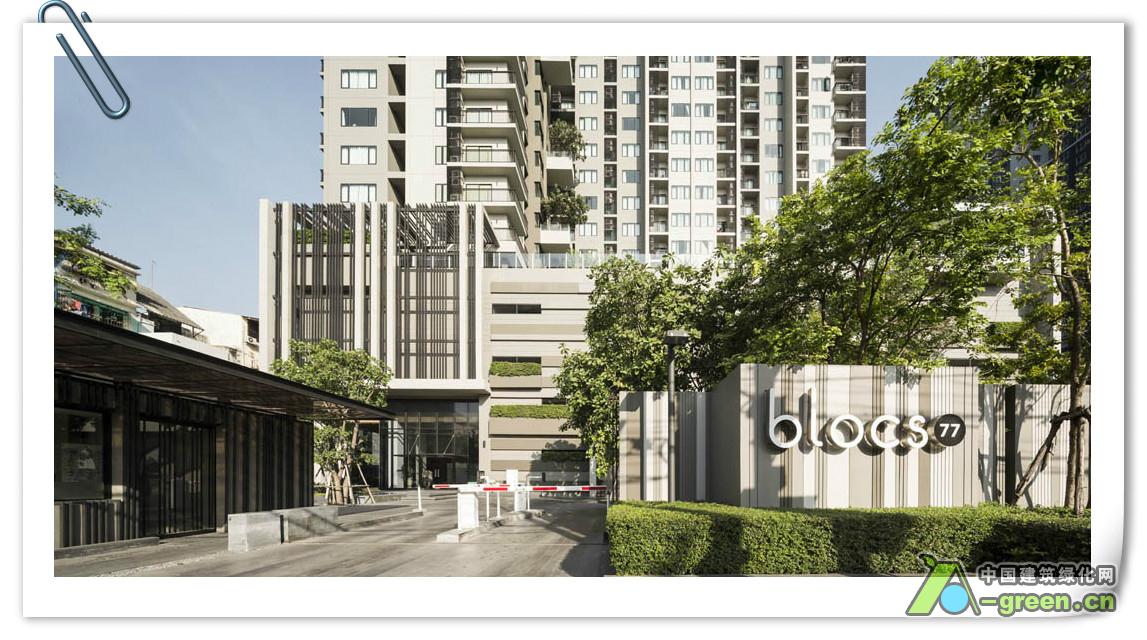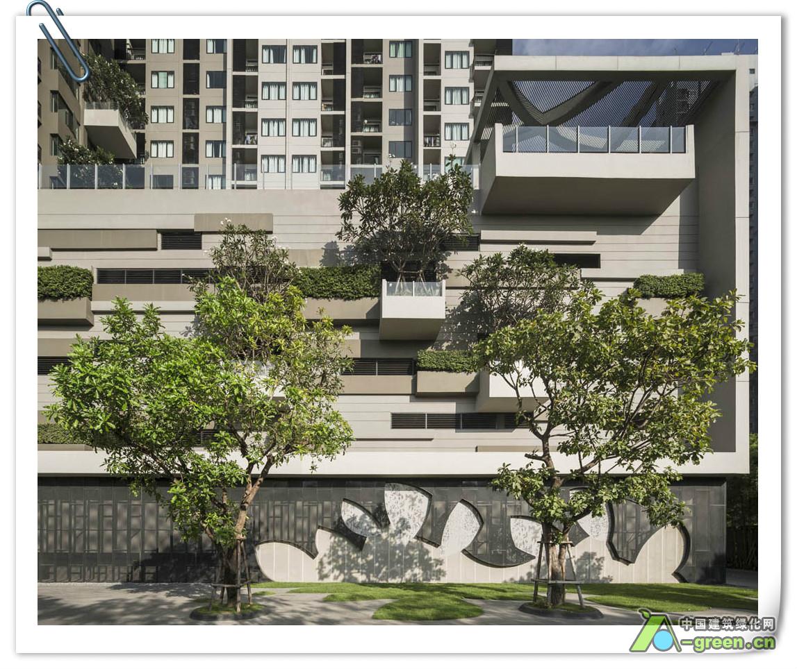 这个梦幻般的景观项目位于泰国曼谷最繁华福地的公寓中。5244平米的用地中容纳了467户住宅单元。客户希望在这个建筑项目中的一楼和五楼(带泳池)修建休闲空间。相面前方是喧闹的街道,后方是宁静的运河和住区。因为用地密度较高,项目需要在周围留出6米的消防通道和一些地面停车场,这意味着地面层有较多的硬质铺装。而高达公寓楼的外饰面也会造成城市热岛效应和炫光反射。因此设计师在地面和里面尽可能多的加上绿色。绿色从水平蔓延到垂直。地面层宁静的水池开启了绿色空间的前奏,立面上在中了植物,空中花园也种满了植物。设计师化弊为利,为居民和城市带来美丽环境。